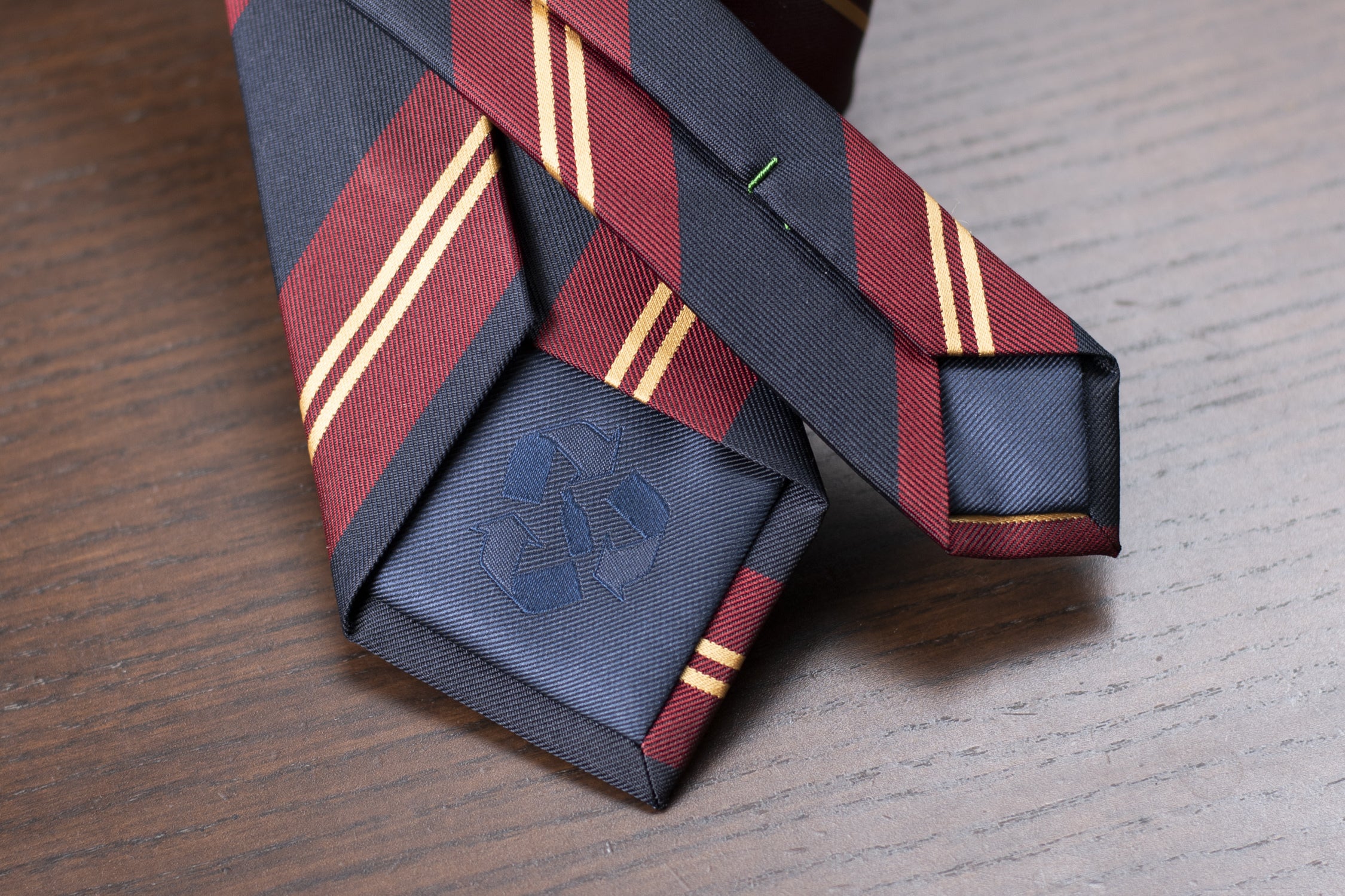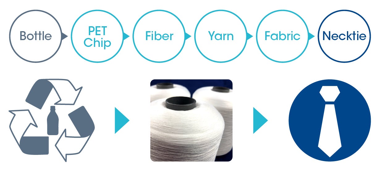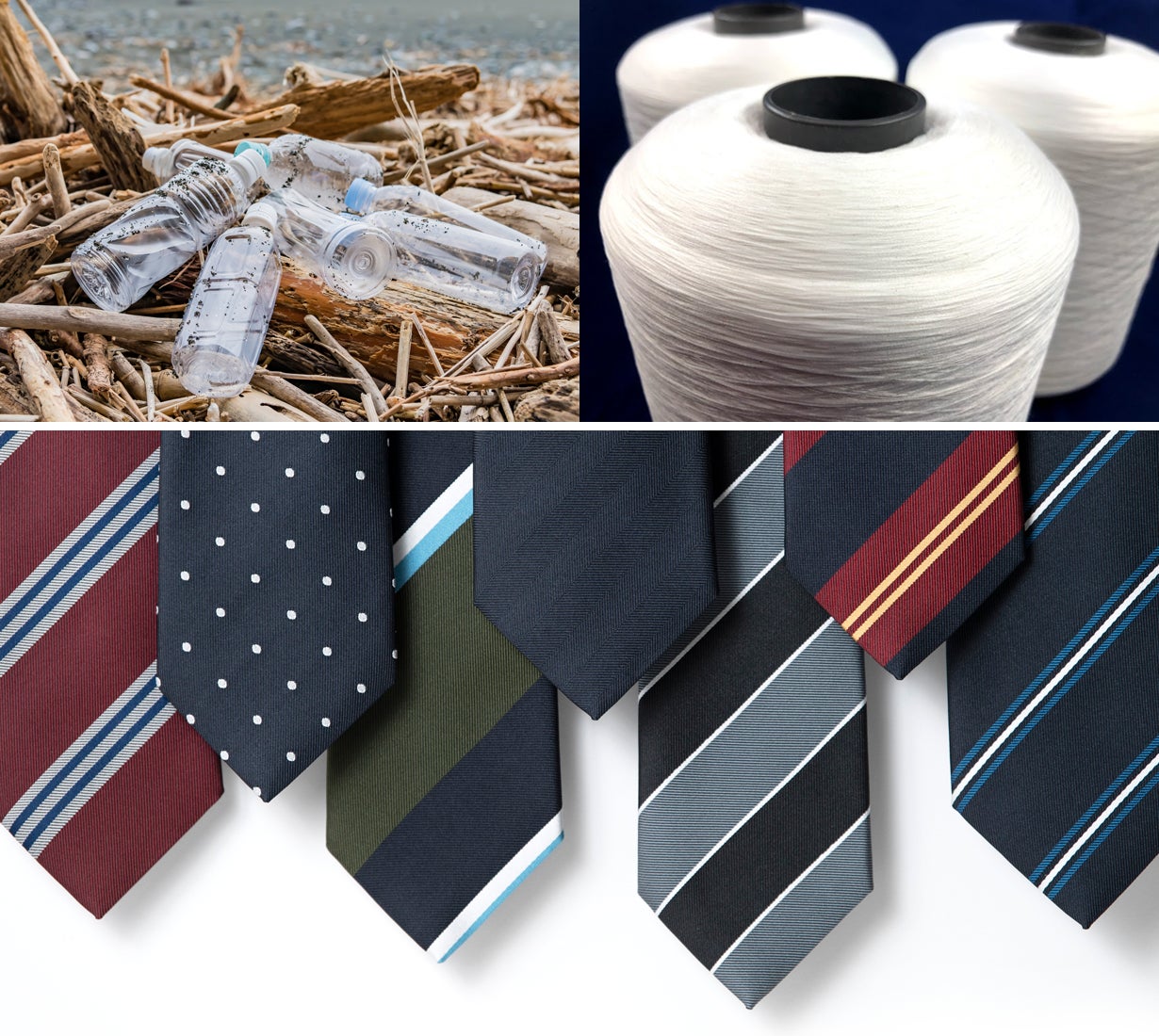 ecoネクタイは、ペットボトルから生まれた再生ポリエステル糸を使用。