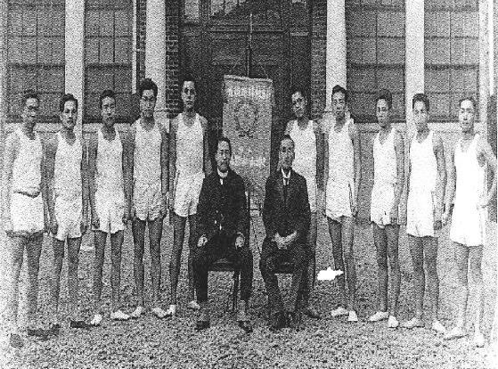 【1921年第2回箱根駅伝で優勝した選手と当時の部長、監督】
