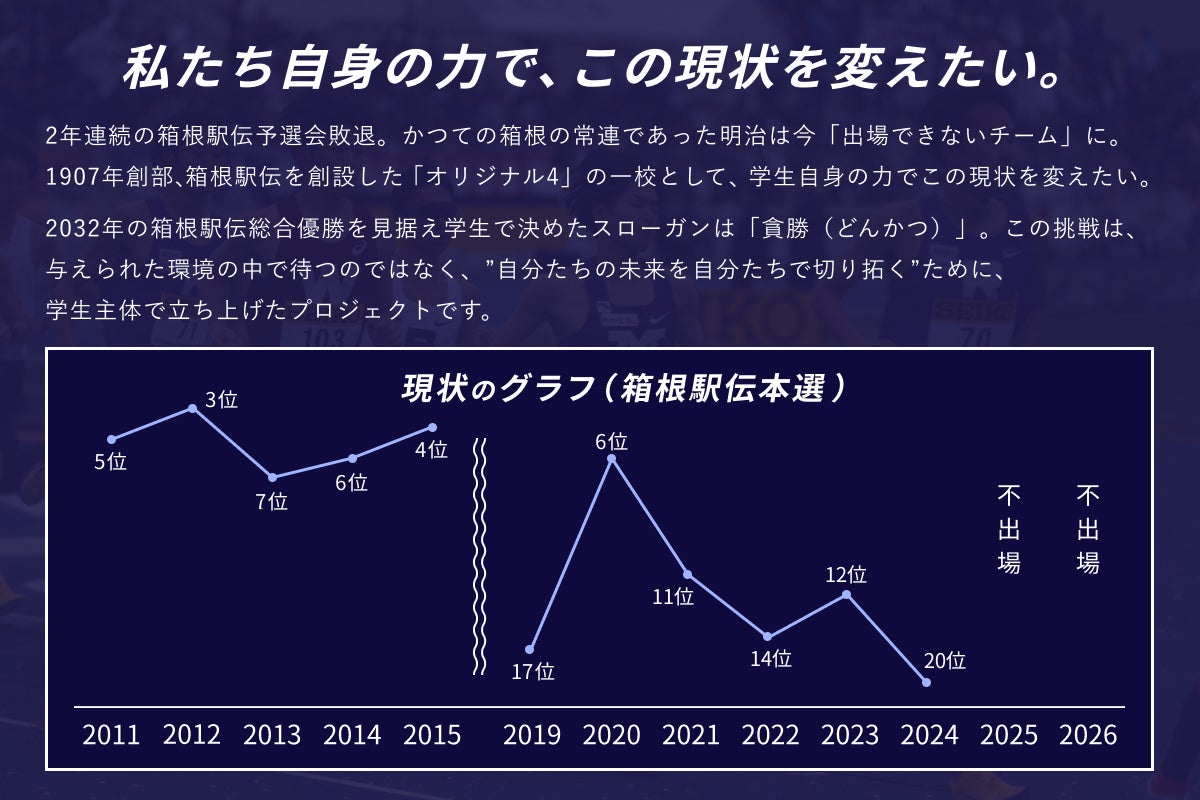 2032 年の箱根駅伝総合優勝を見据え、過去の栄光ではなく、日々の生活から貪欲に、 未来の勝利で証明するために。あと一歩を埋める戦いが、ここから始まります。