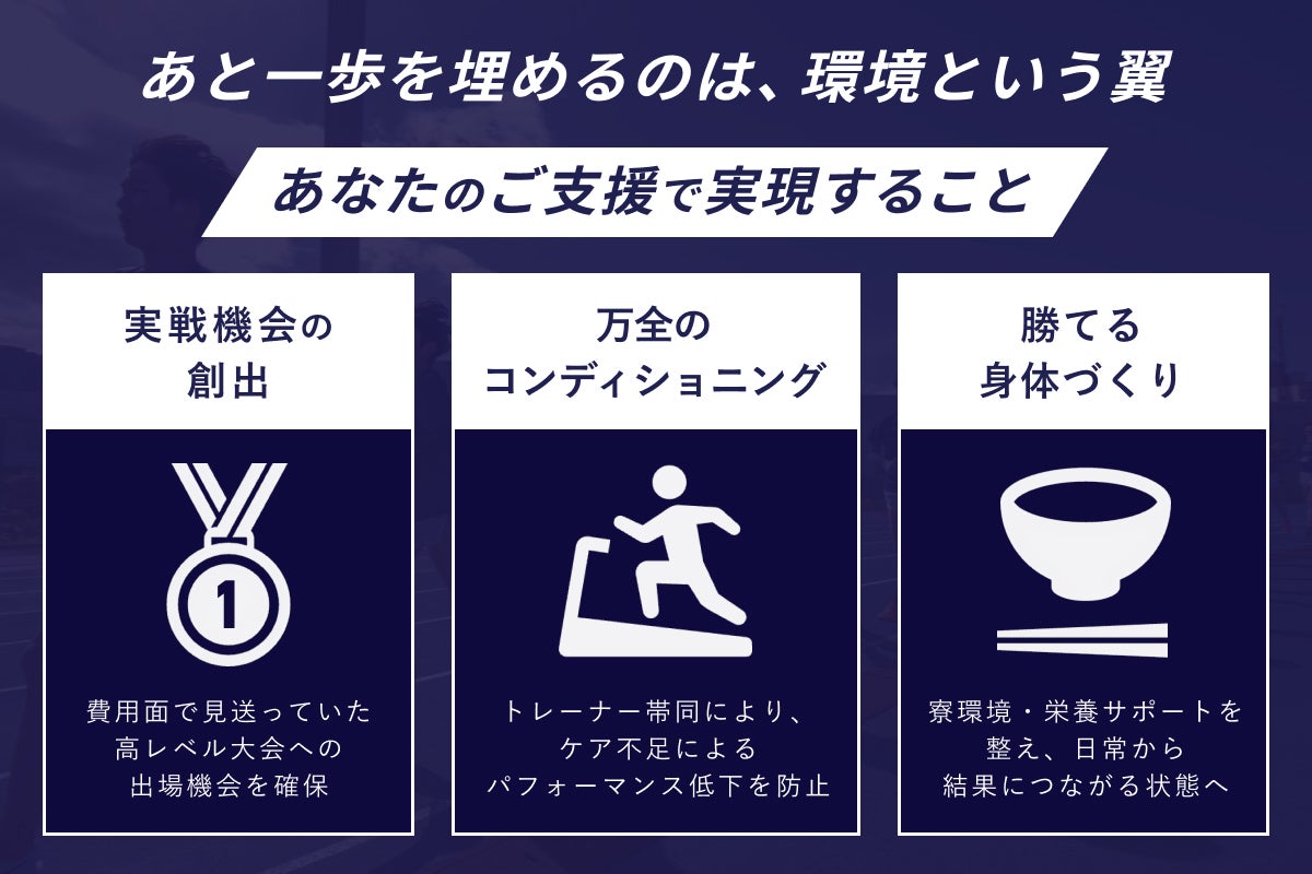平素より、当部へ温かいご支援とご声援を賜り、心より御礼申し上げます。私たちは今年度、「箱根駅伝出場」そしてその先の「シード権獲得」という大きな目標を掲げ、部員一丸となって日々の厳しい練習に励んでおります。この度、その目標を確かな形にするための新たな挑戦として、クラウドファンディングを実施することにいたしました。皆様からいただいたご支援は、選手たちがより高いレベルで競技に向き合える環境づくりに大切に活用させていただきます。皆様の応援を力に変え、必ず箱根の舞台で結果を残せるよう精進してまいります。部員一同、全力で駆け抜けますので、どうか温かいご支援のほどよろしくお願いいたします。