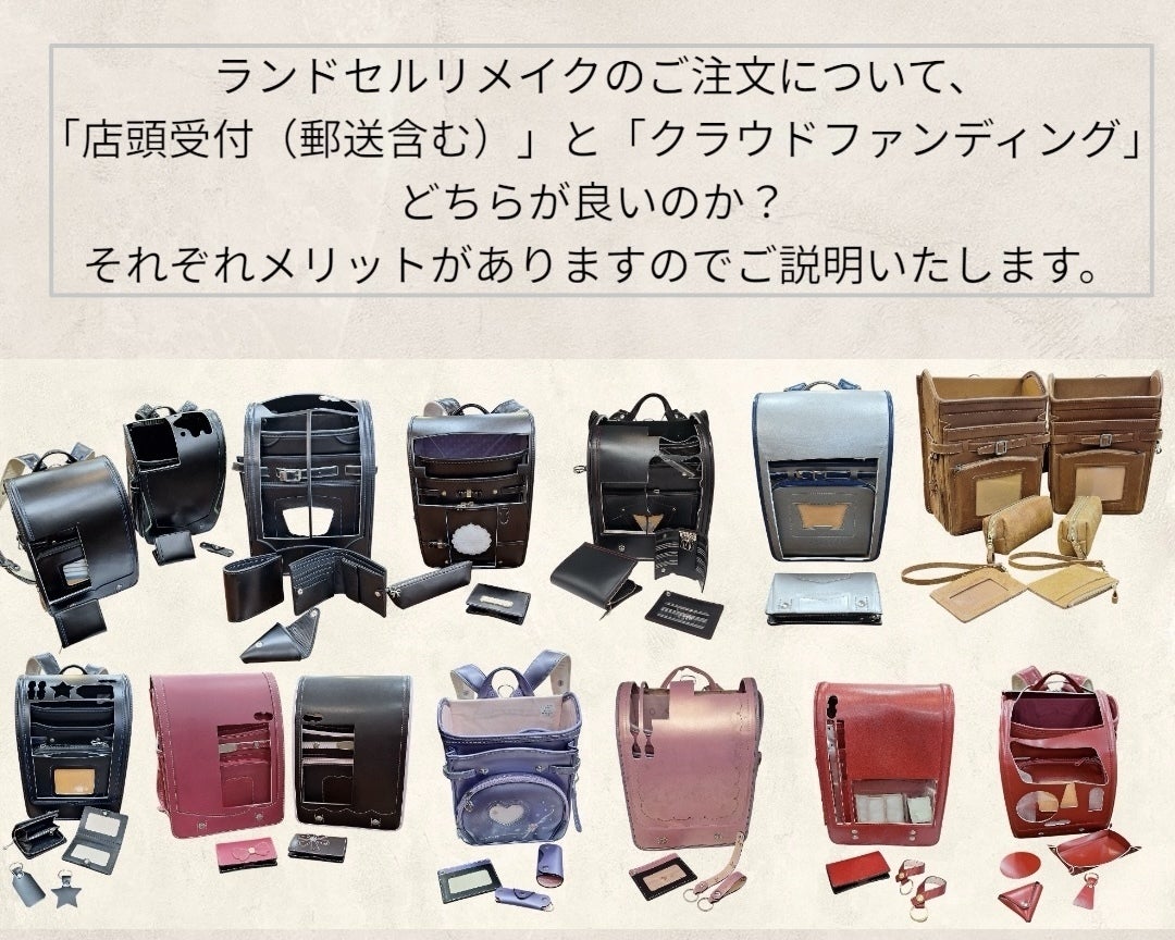 2026/04/14 17:17プロジェクト公開から多くのご支援・応援をいただき、本当にありがとうございます。活動報告やメッセージの中で、 「店頭受付とクラウドファンディングはどちらで申し込むのが良いですか?」 というご質問をいただくことがあります。それぞれにメリットがありますので、簡単にご紹介します。【店頭受付】 ・アイテム1点から製作可能 ・お好きなアイテムの組み合わせで製作できます ・クラファンのセットにない組み合わせも可能です 【クラウドファンディング】 ・アイテムの組み合わせはあらかじめ決まっています ・店頭で同じ組み合わせを選ぶより、少しお得な価格になっています ・プロジェクトを応援する形でご参加いただけますまとめると、「好きなアイテムを自由に選びたい」方は店頭受付、 「セットで少しお得に製作したい」方はクラウドファンディングがおすすめです。ご検討中の方の参考になれば嬉しいです。 ご不明な点がありましたら、お気軽にメッセージでお問い合わせください。引き続き応援よろしくお願いいたします。 もっと見る【リターン追加のお知らせ】ランドセルがなくても参加できます!