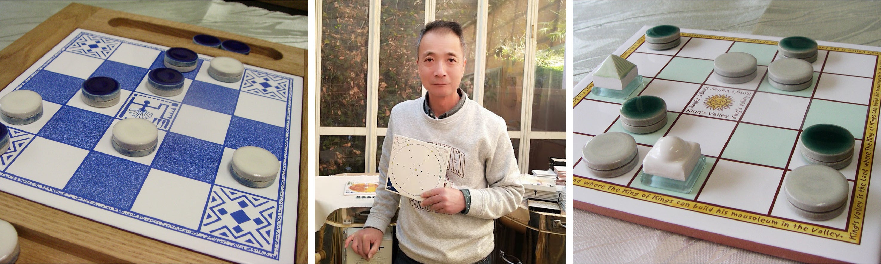 オリジナルのボードゲームを作り続けて30年。主にタイルや陶磁器素材を使い、囲碁や将棋のような運の要素の無いボードゲームを創作しています。80作品以上のゲームを創作していますが代表作にヨンモクやキングスバレーなどがあります。