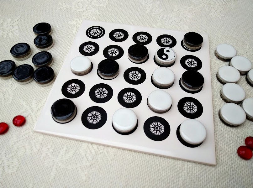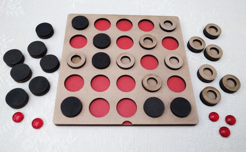 5x5=25マスのボード上で25個の平面と凹面のリバーシブル駒を用いた2人プレーゲームです。より多くの自色の駒を配置したプレーヤーが勝ちです。