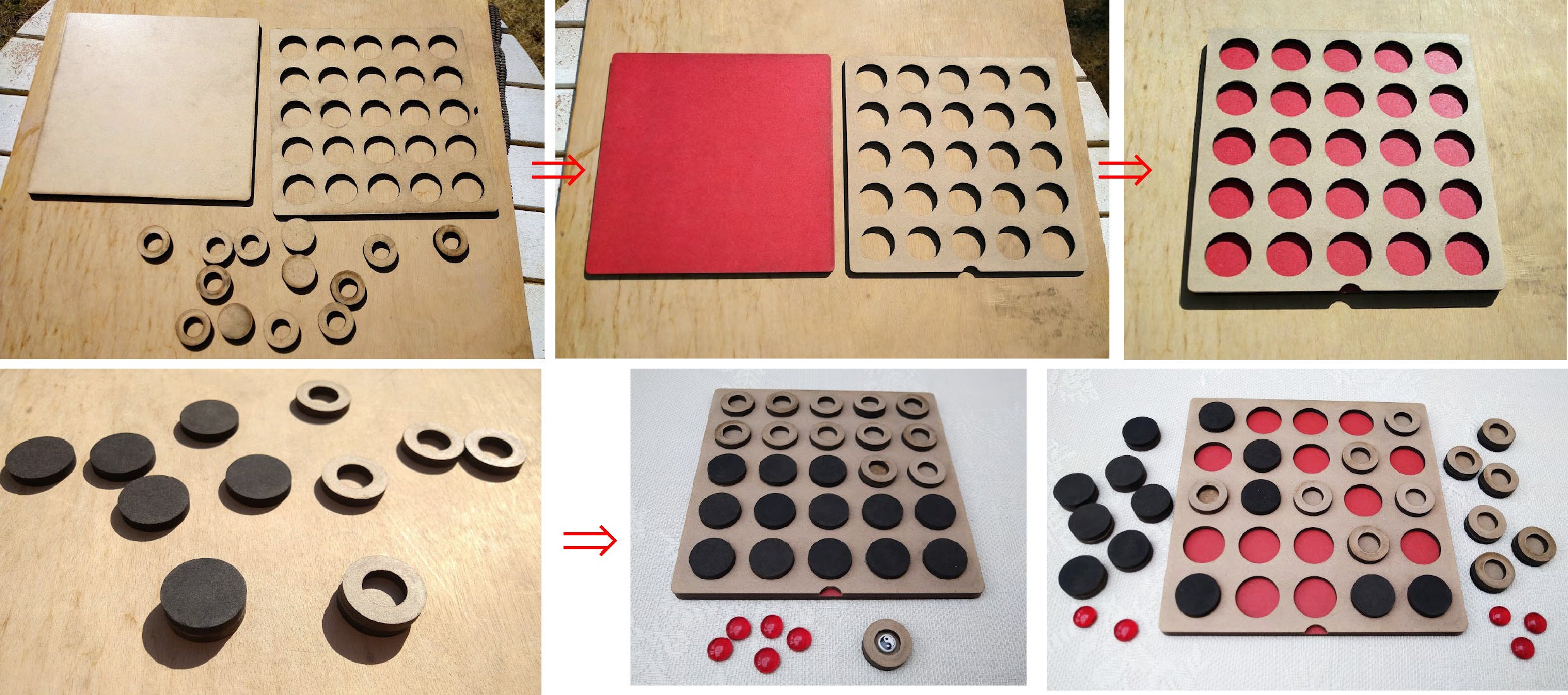 試行錯誤の中でレーザー加工で駒とボードを一体で製作すれば多品種少量制作でもコストを下げたボードゲーム製作が可能なことが分かりました。