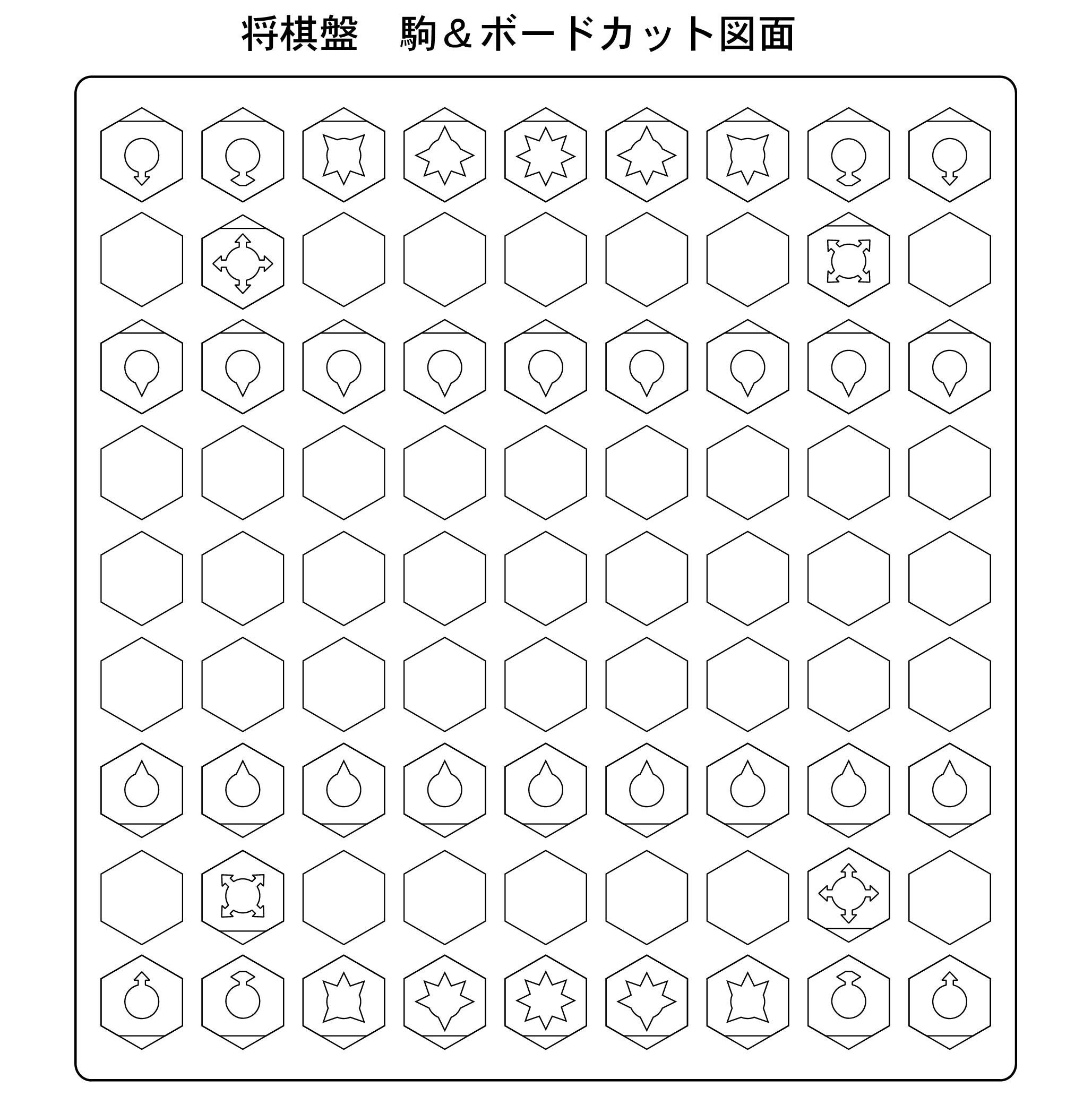 そこで駒の大きさを統一して六角形にし後ろ部分にスリットを入れることで敵味方の区別がつくようになります。文字の代わりの動ける方向をアイコン化して彫刻すれば手触りで駒の種類も判別できるようになります。これなら漢字を読めない外国の人もプレーができるようになります。