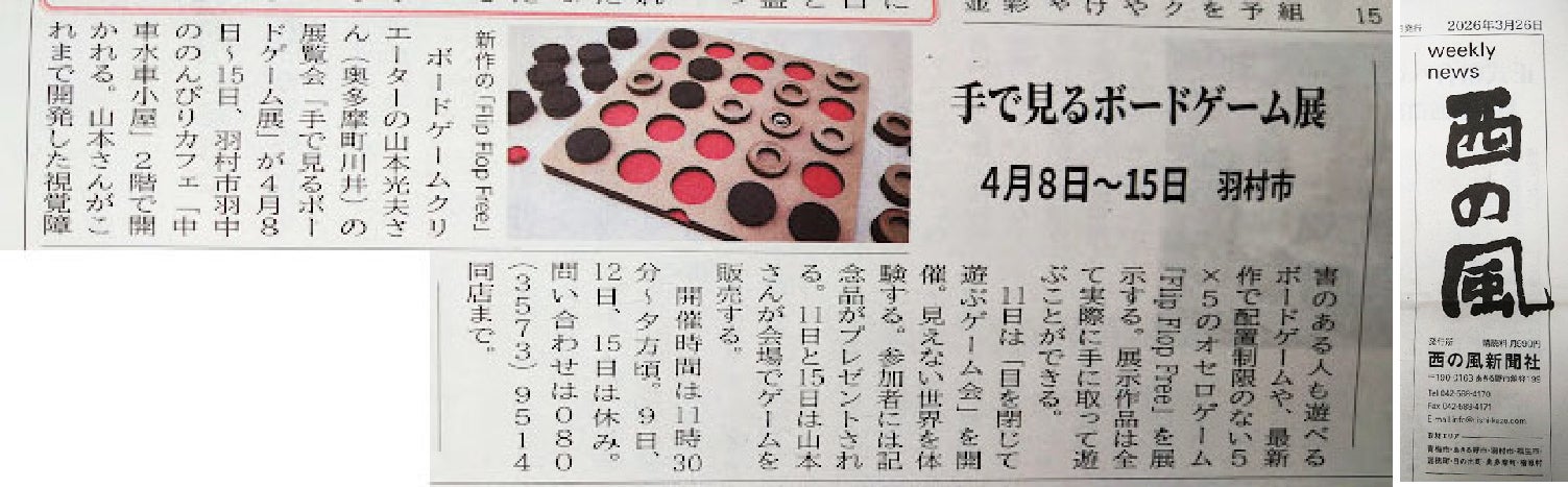 地元のローカル新聞「西の風」で4月に行う「手で見るボードゲーム展」の紹介記事を掲載してくれました。