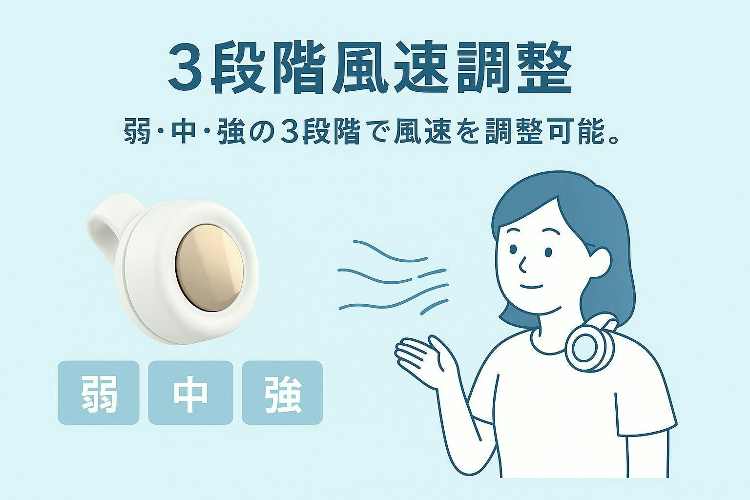 A:3段階で調整可能。強モードでは体感で3〜5℃の涼しさを感じられます。