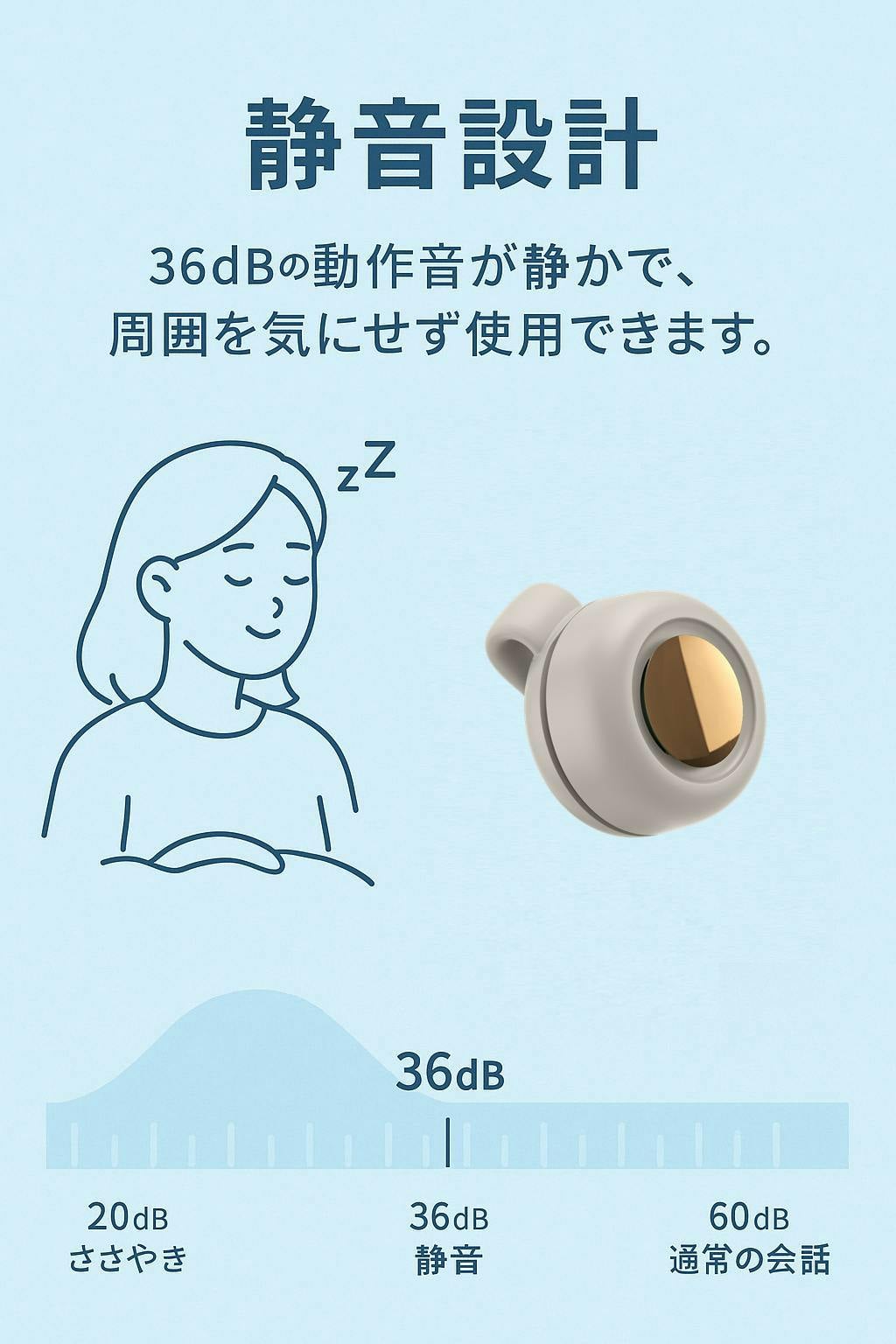 A:図書館レベルの静かさ。睡眠中や赤ちゃんの近くでも安心です。
