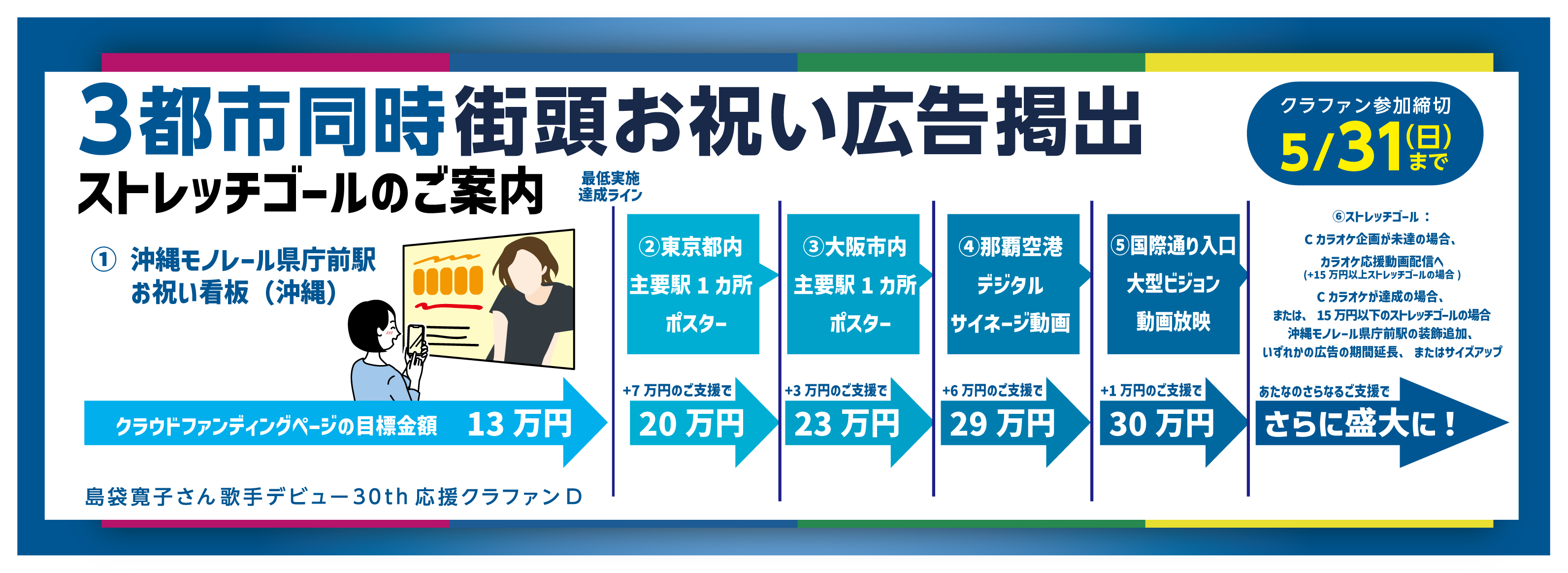 ⑥ストレッチゴール: Cカラオケが未達の場合、Cカラオケへ、Cカラオケが達成の場合、沖縄モノレール県庁前駅の装飾追加、、いずれかの広告の期間延長、またはサイズアップ