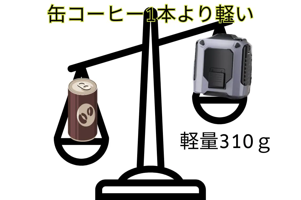 軽量・コンパクトで持ち運びにも◎ 重さは約310gで缶コーヒー1本より軽く、サイズも手のひら大。 必要なときに腰に巻くだけの簡単装着。