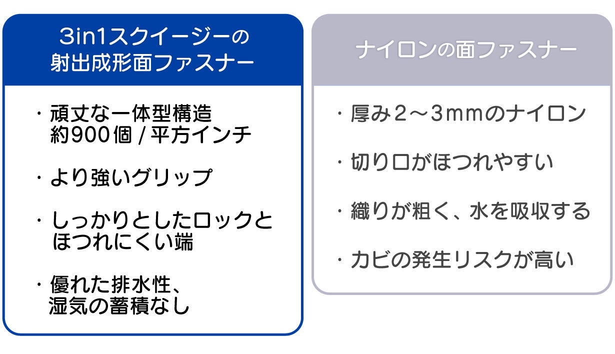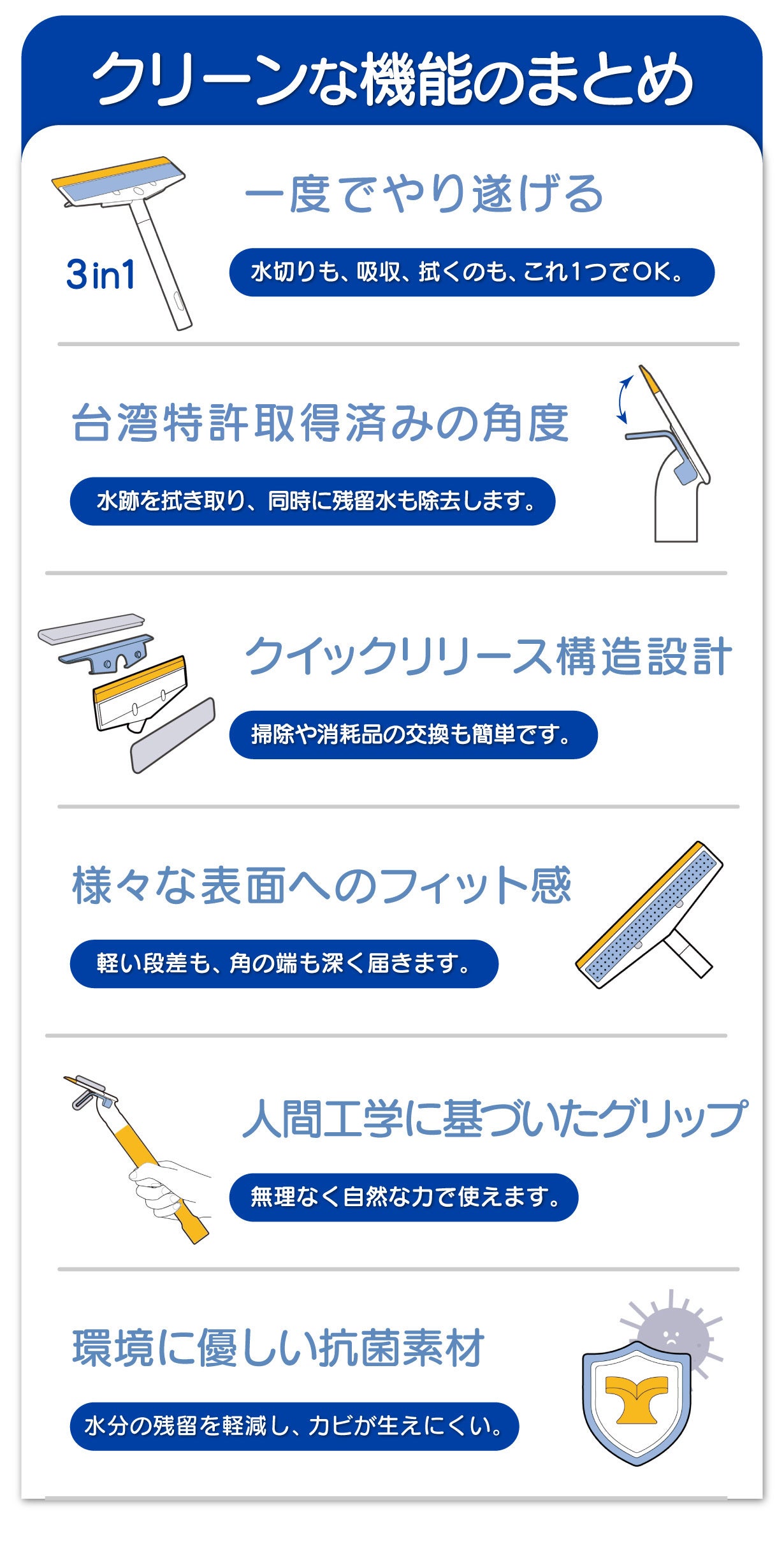 この新スクイージーの開発には、並々ならぬ努力が注がれました。複数回にわたる市場調査、数え切れないほどの設計修正、厳格な試作金型(トライモールド)、そして何度もプロトタイプ検証を実施しました。この緻密なプロセスによって、細部の一つ一つが磨き上げられました。この3in1スクイジーは、台湾特許取得の「水垂れ防止角度」、しっかりとした射出成形の面ファスナー(フック&ループ)、簡単に取り外して剥がせるクイックリリース機構、そして角にぴったり密着する独自形状のヘッドを備えています。この3in1スクイージーの完成によって、“拭き筋が残らず、ラクで、衛生的”な掃除を実現し、Huroyamaのこだわりを体現することができたことを誇りに思います。