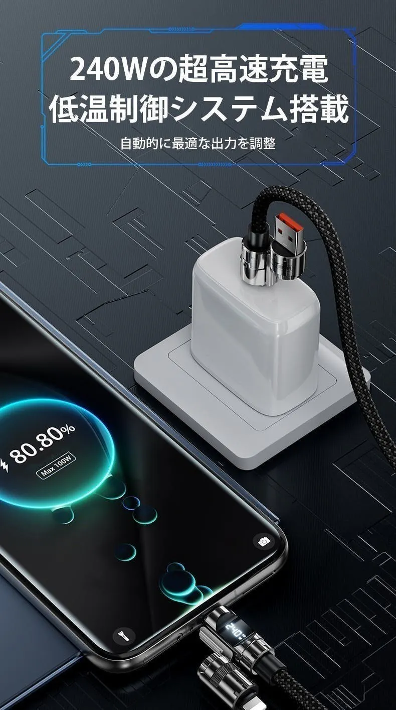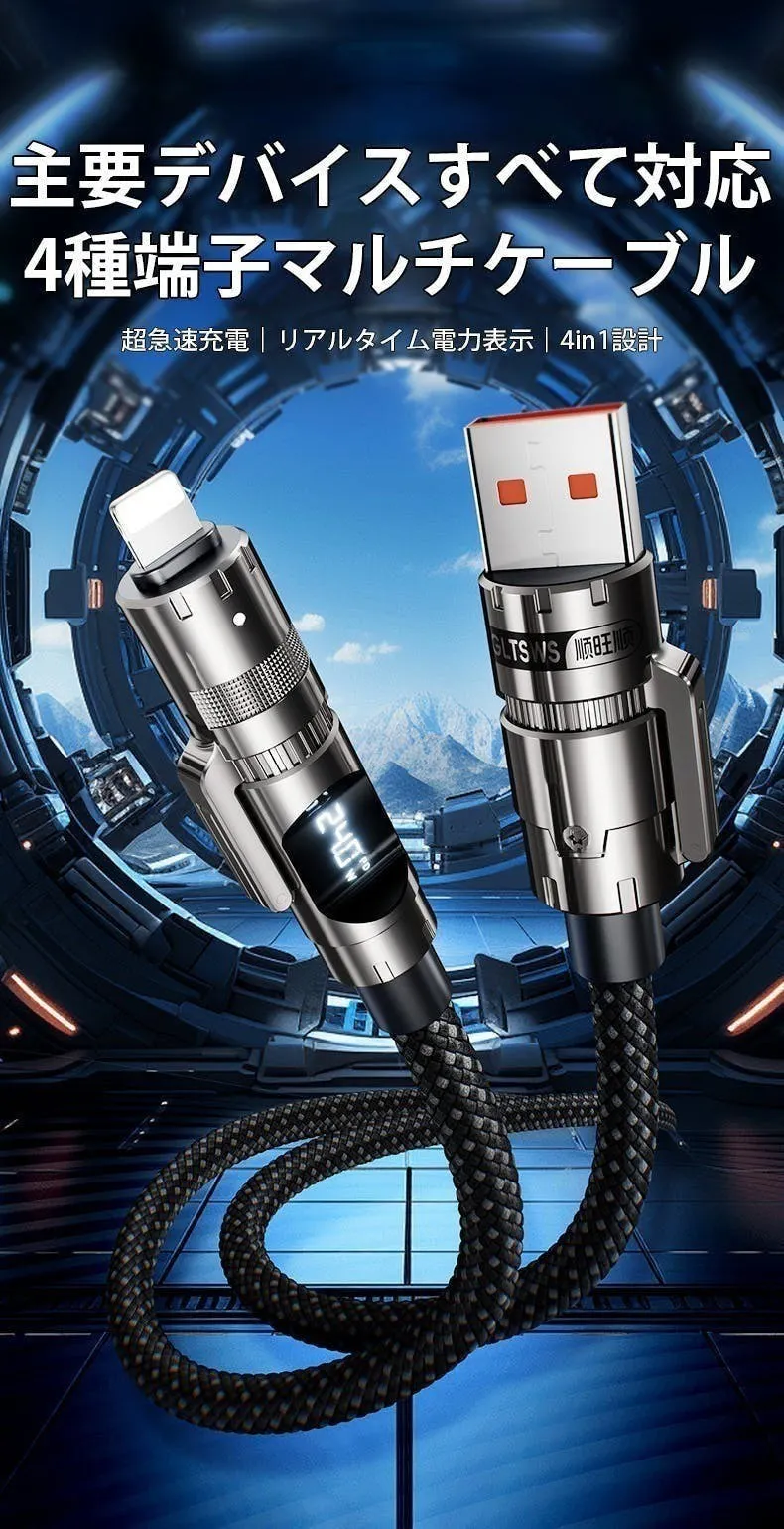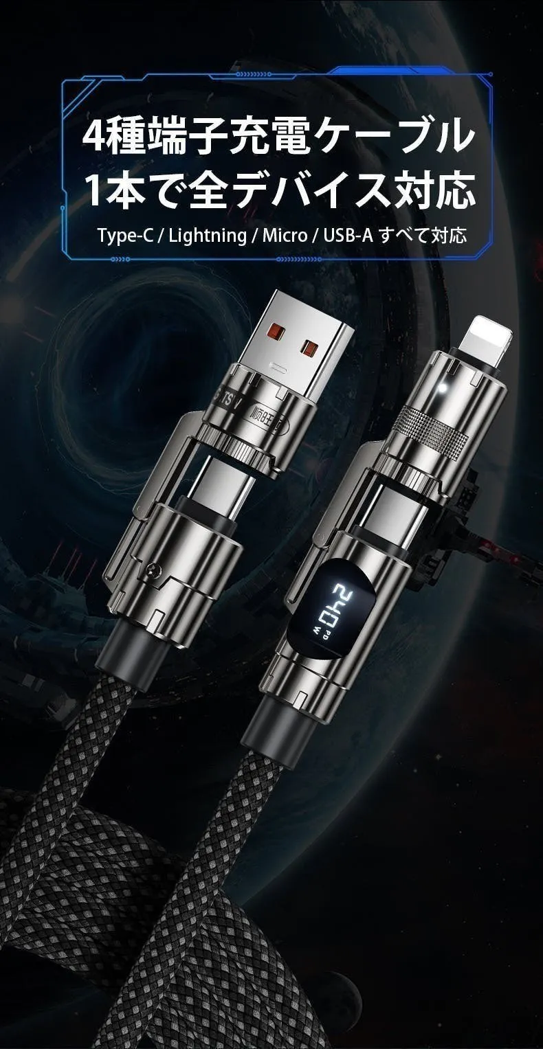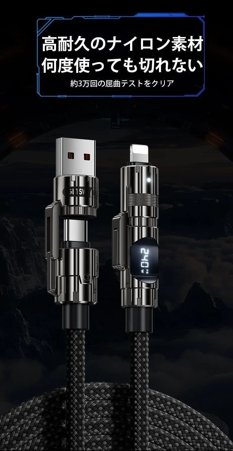本製品は4種類の端子を1本に集約しているため、スマホ・ノートPC・タブレット・ゲーム機まであらゆるデバイスをこれ1本で充電でき、複数のケーブルを持ち歩く手間から解放されます。