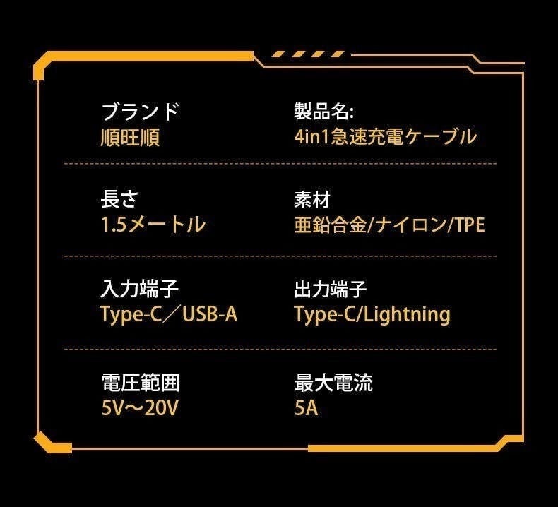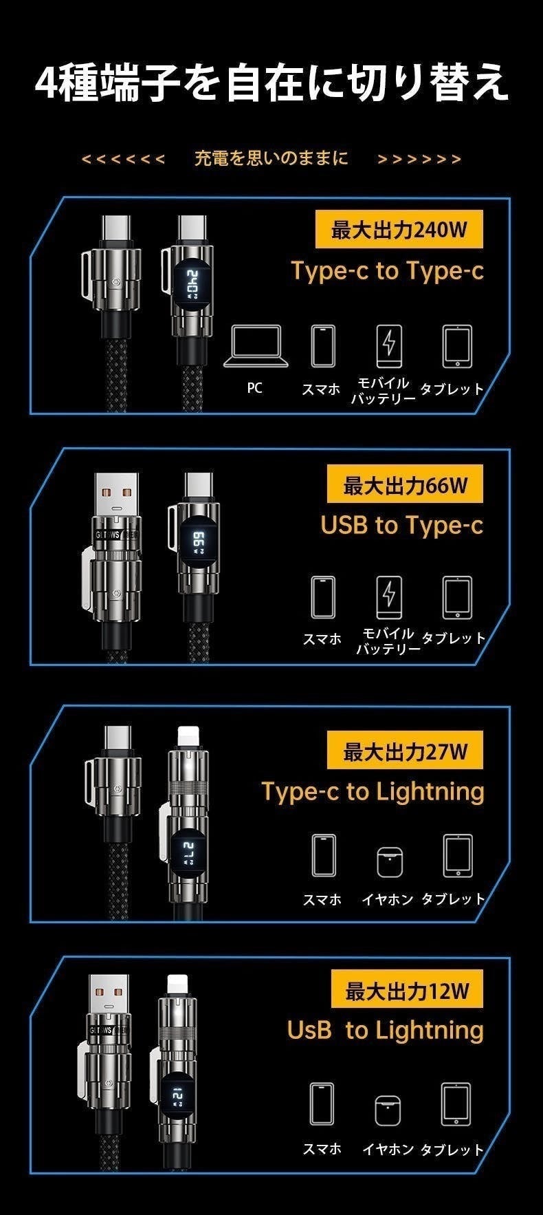本製品は4種類の端子を1本に集約しているため、スマホ・ノートPC・タブレット・ゲーム機まであらゆるデバイスをこれ1本で充電でき、複数のケーブルを持ち歩く手間から解放されます。
