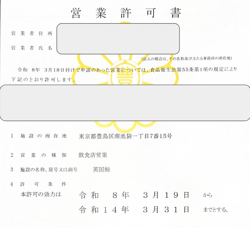 支援者の皆さまこの度は、英国鮨(イギリスシ)クラウドファンディングのご支援、本当にありがとうございます。来月4月末オープンに向けて、着実に準備を進めております。昨日は、豊島区保健所にて営業許可書を取得いたしました!▼営業許可書です!まだまだやるべきことは多いですが、少しずつ前進しております。引き続き、応援のほどよろしくお願いいたします!
