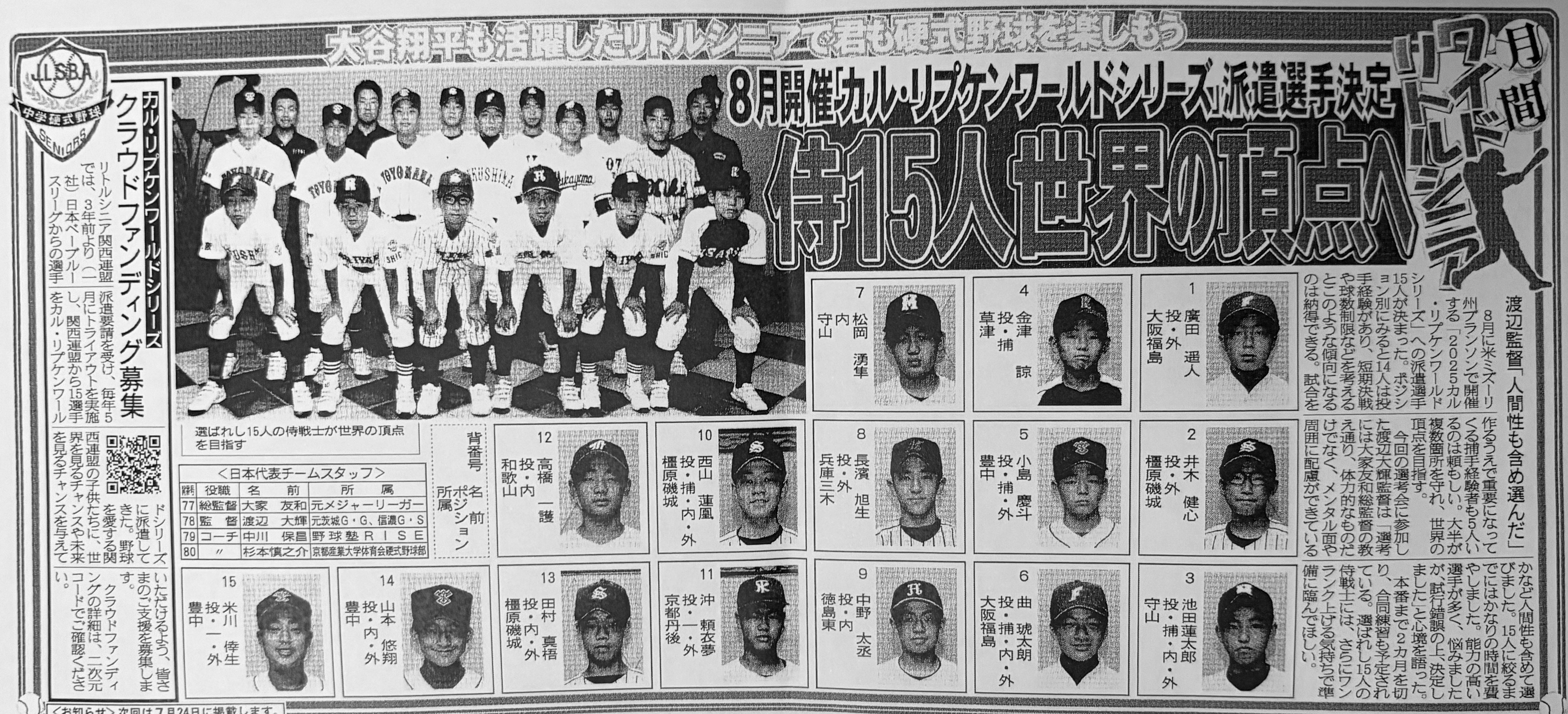 この15人で、アメリカの「カル・リプケンワールドシリーズ2026」へ挑戦します!