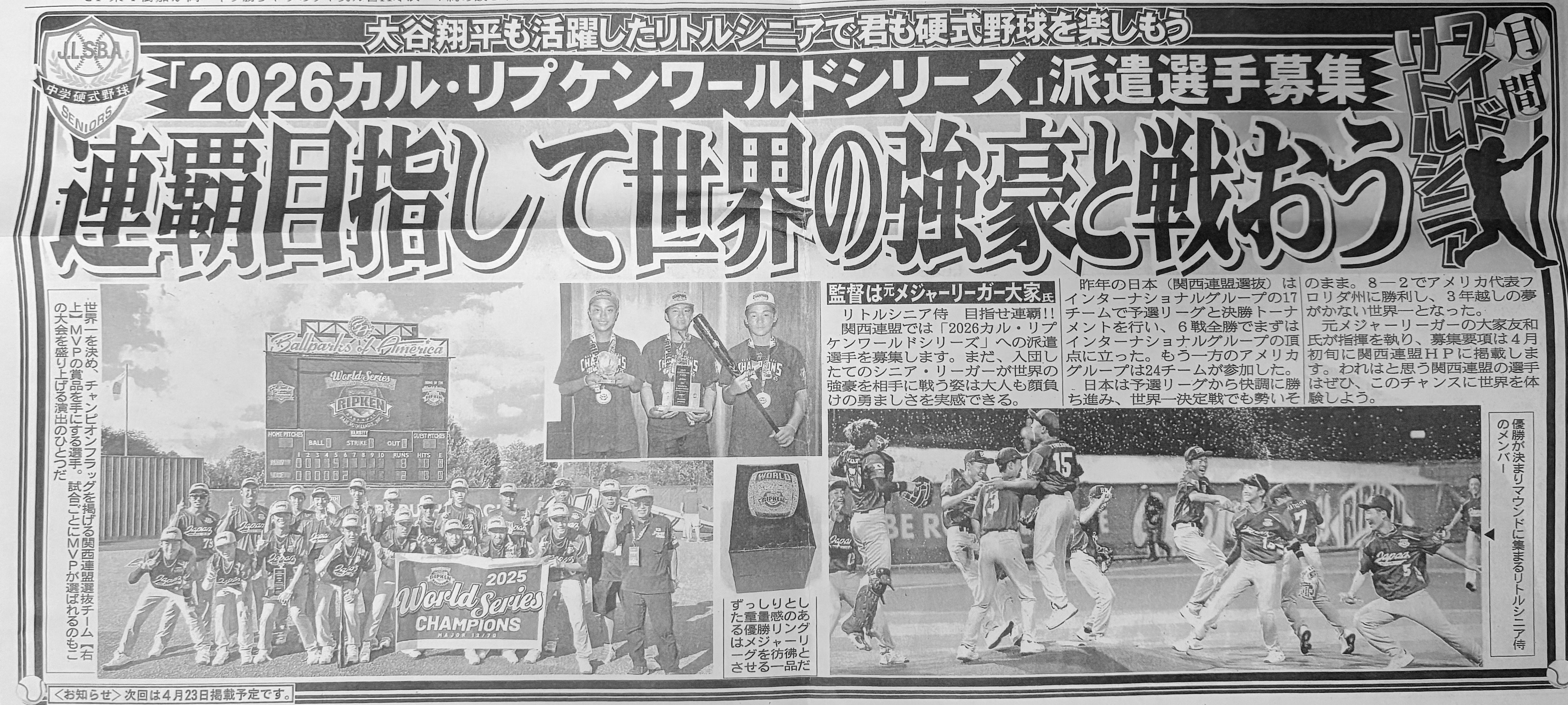 今年の監督は3年連続、去年に引き続き、元メジャーリーガーの大家友和氏。大家監督率いる『大家ジャパン2026』が、8月2日、アメリカに向け出発します!