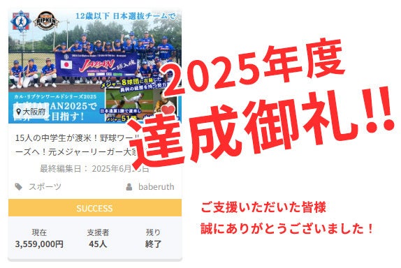 今年の5月トライアウトで選抜し、12歳以下で結成された少年野球チーム15名で、来たる8月にアメリカで行われる世界大会[カル・リプケンワールドシリーズ2026]に優勝”連覇”目指して挑みます。