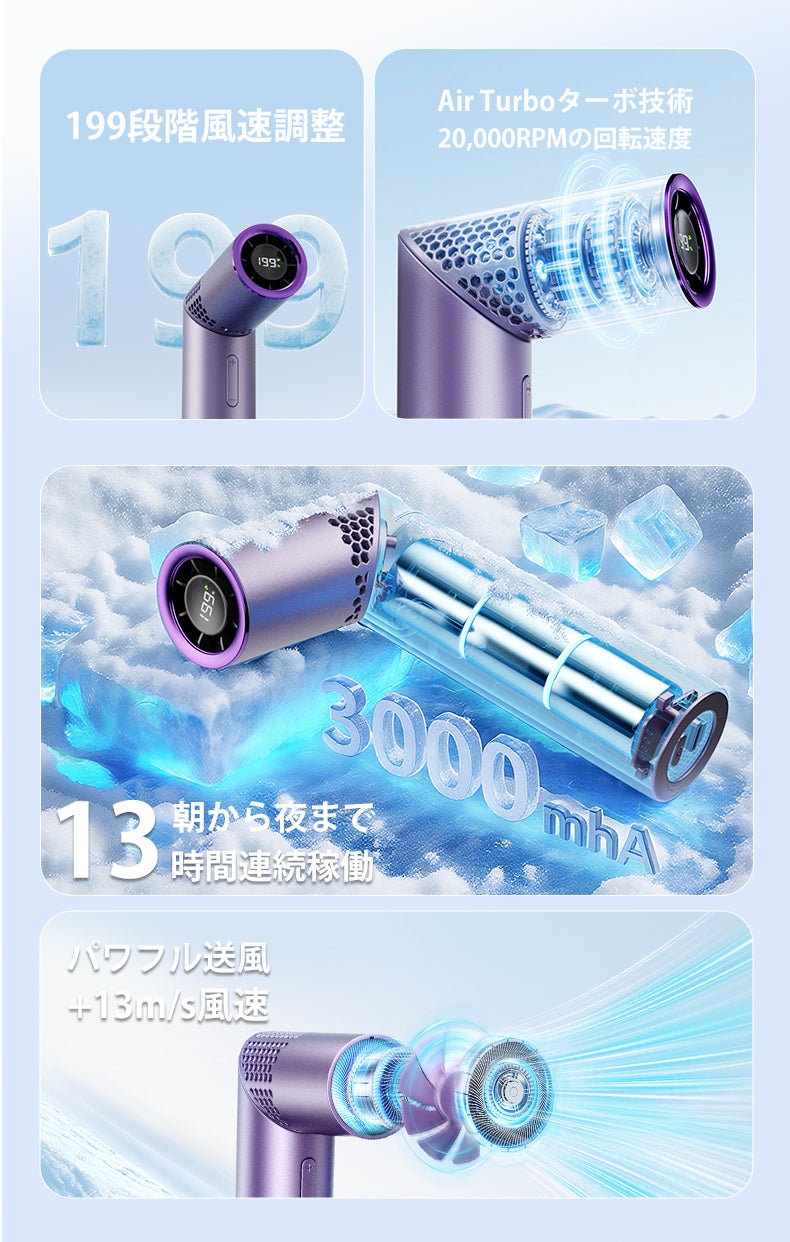 ① 手のひらサイズで最大13m/sのパワフル風、猛暑の屋外でも瞬時にクール! ② 199段階風量でシーンに合わせて細かくコントロール可能。 ③ 90°角度調整&3WAY対応で、手持ち・卓上・首掛け自由自在。