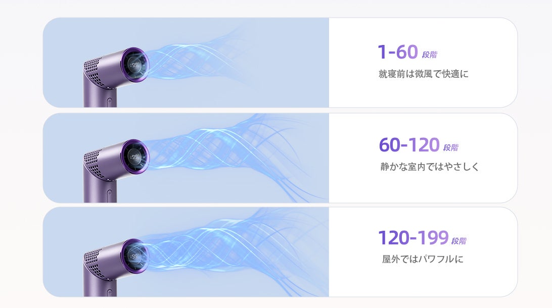 弱風から強風まで、199段階の細かな風量調整が可能。