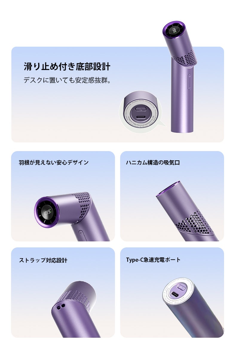 そして、隠し羽根デザインを採用し、最大20,000RPMの高速回転と、最大風速13m/sのパワフルな送風を実現。コンパクトな見た目からは想像できない、驚きの風力。