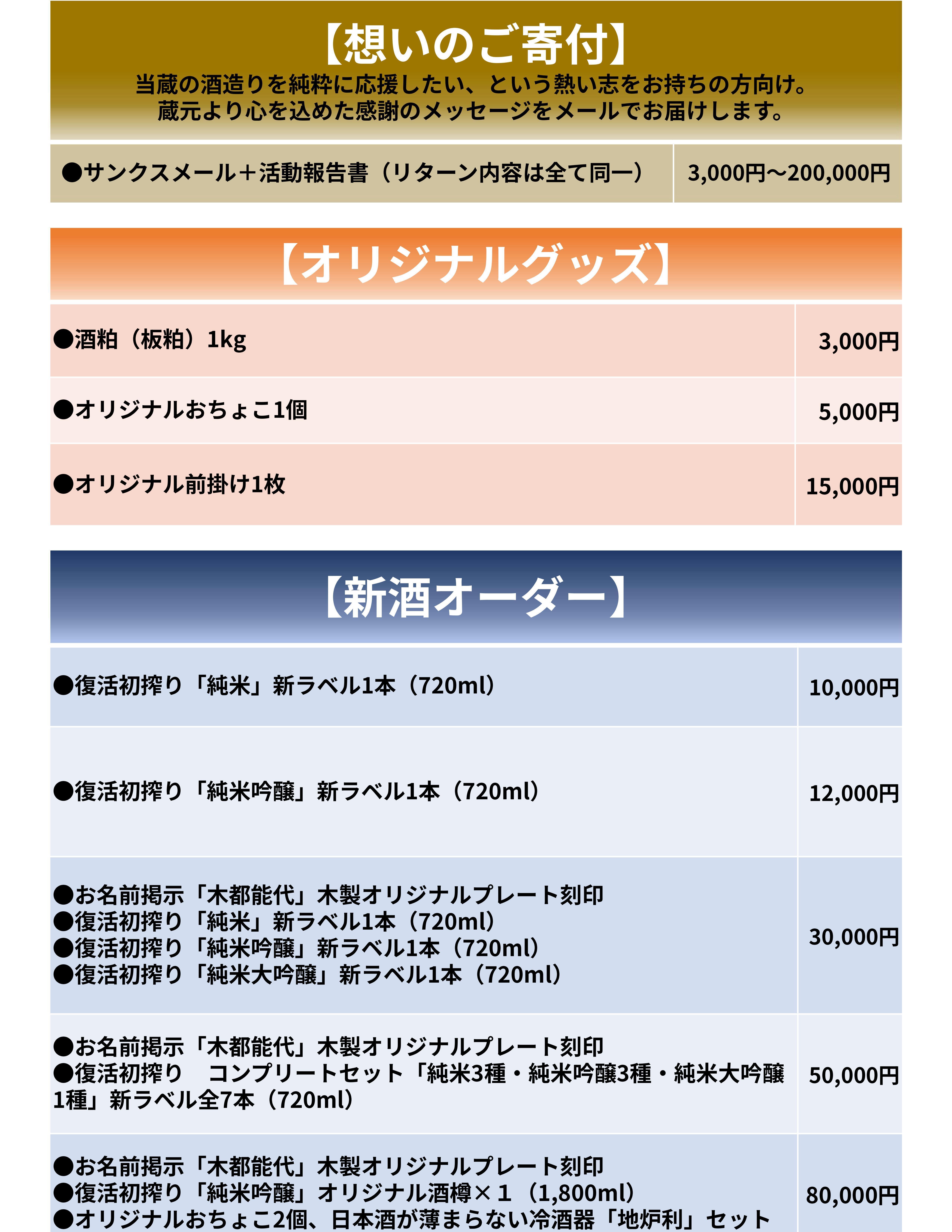 • リブランディング費用: トンネル熟成の価値を伝える新デザイン・パッケージの開発 広報・マーケティング: 能代の酒を全国、そして世界へ発信するための体制構築 EC・デジタル化: 支援者の皆様と直接繋がり、継続的なファンコミュニティを作るための基盤整備