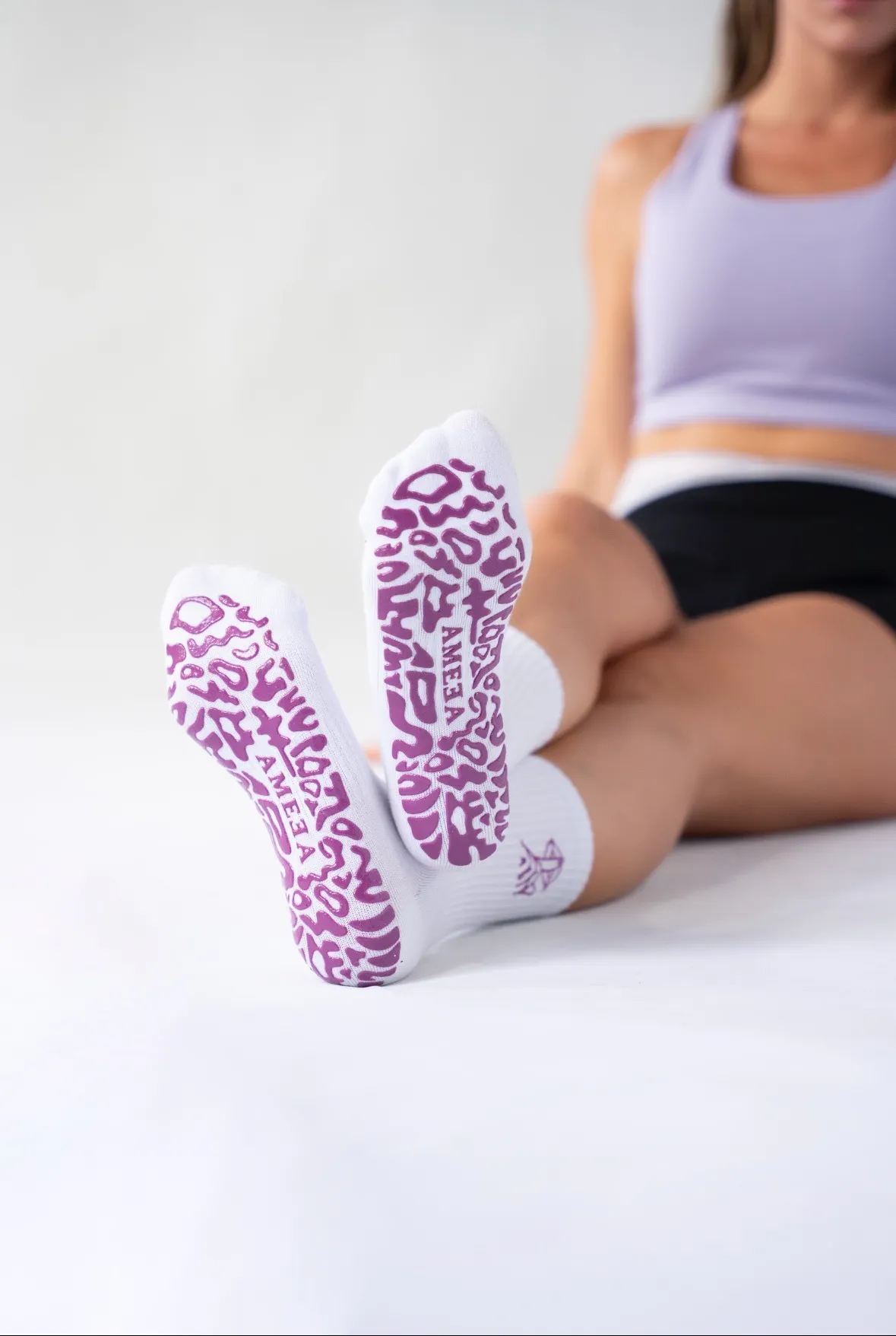 独自開発の高品質なシリコングリップを採用。リフォーマーやマットへの吸い付きが非常に強く、激しい動きやバランスを要するポーズでも足元が一切ブレません。裸足以上の安定感を提供し、正しいフォームへの集中を助けます。