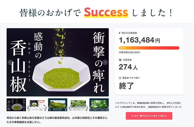 2026/04/09 13:00改めまして、山椒プロジェクトを運営しておりますロカルコストアの後藤です。第一弾に続き、今回はアンコールとしてプロジェクトを実施いたしました。第一弾から日を空けず開催となりましたが、早々にご支援をくださいました方もおり大変嬉しく思います。本当にありがとうございます。第一弾が終わる頃、期間を延ばして欲しいというお声を頂戴したことをきっかけとしてアンコールという形で挑戦することを決めました。短い期間とはなりますが、最後までみなさま応援の程よろしくお願いいたします。今回のプロジェクトでは、前回とマイナーチェンジしている点があります。¥2,000のコースを拡充し、ご飯のお供どちらかか、フリーズドライ実山椒が選べる形になって登場です。第一弾をご購入いただいたみなさまにもリピートとして選べるような形にいたしました。山椒プロジェクト自体はここから繁忙期に差し掛かります。5月より希少な実山椒の収穫が始まるのでその様子もお届けできればと思います。最後に、ご支援いただいている皆様と共に、和歌山が誇るぶどう山椒を未来へ繋ぐプロジェクトです。賛同いただける方は是非SNS等で拡散いただければと思います。プロジェクト終了までどうぞよろしくお願いします! もっと見る