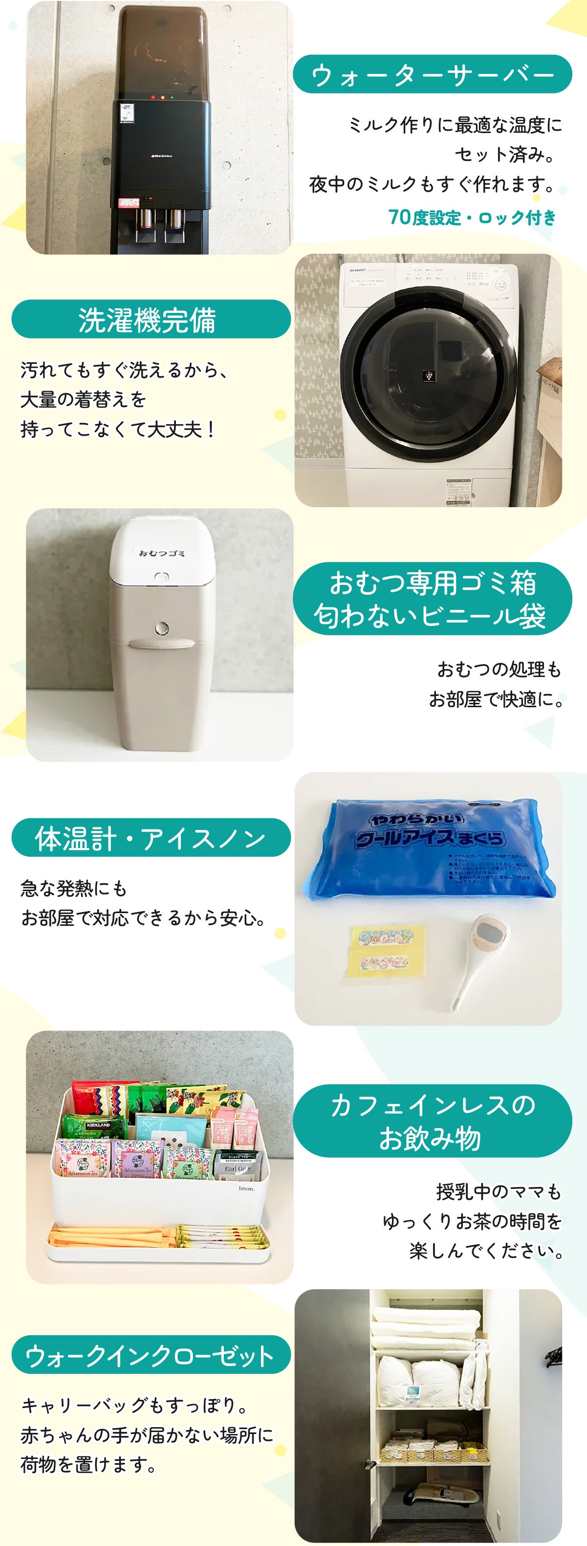 授乳中でも安心して飲めるカフェインレスのお飲み物や、ゆったりくつろげるルームウェア、帰宅後の洗濯の負担をなくす洗濯乾燥機など、ママが「自分もちゃんと労ってもらえてる」と感じていただける工夫をお部屋に詰め込みました。