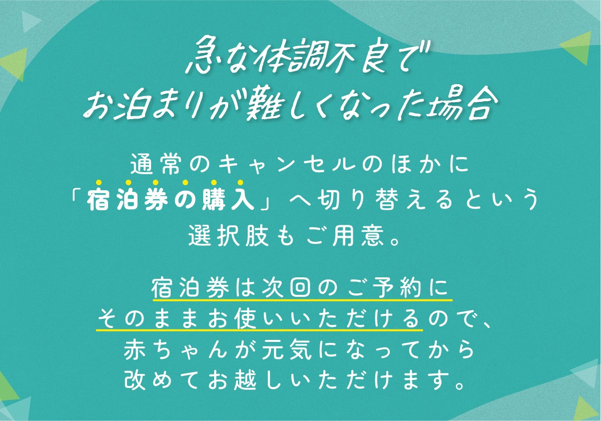 宿泊券は次回のご予約にそのままお使いいただけるので、赤ちゃんが元気になってから改めてお越しいただけます。