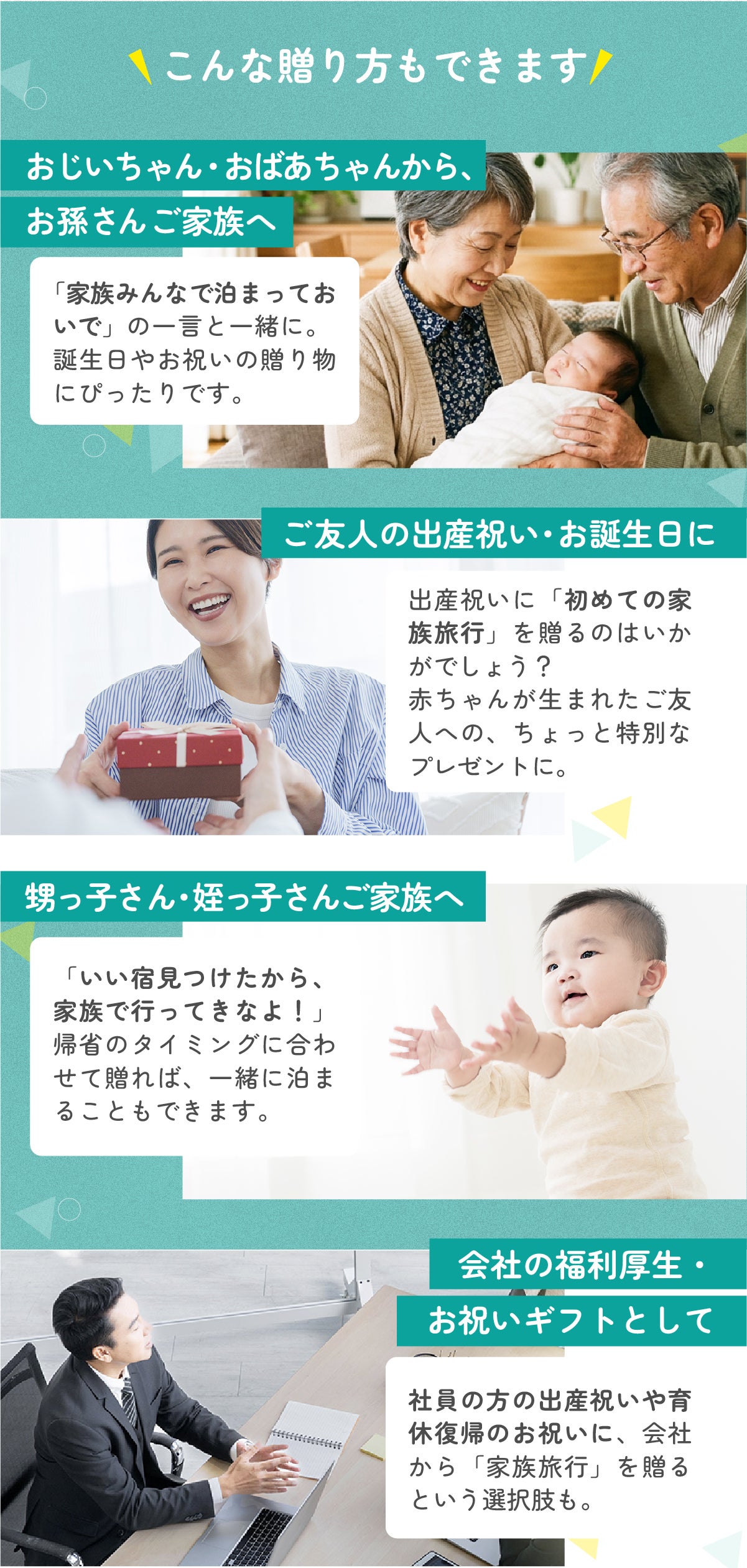 おやこホテルの宿泊ギフト券は、ご自身でのご利用はもちろん、さまざまなシーンで「旅行を贈る」プレゼントとしてお使いいただけます。