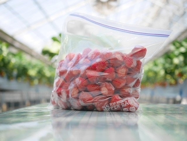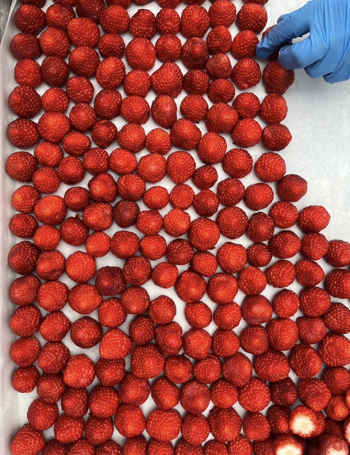 いちごを並べる作業: いちごを冷凍する時、いちご同士がくっついていると冷凍時についてしまうため