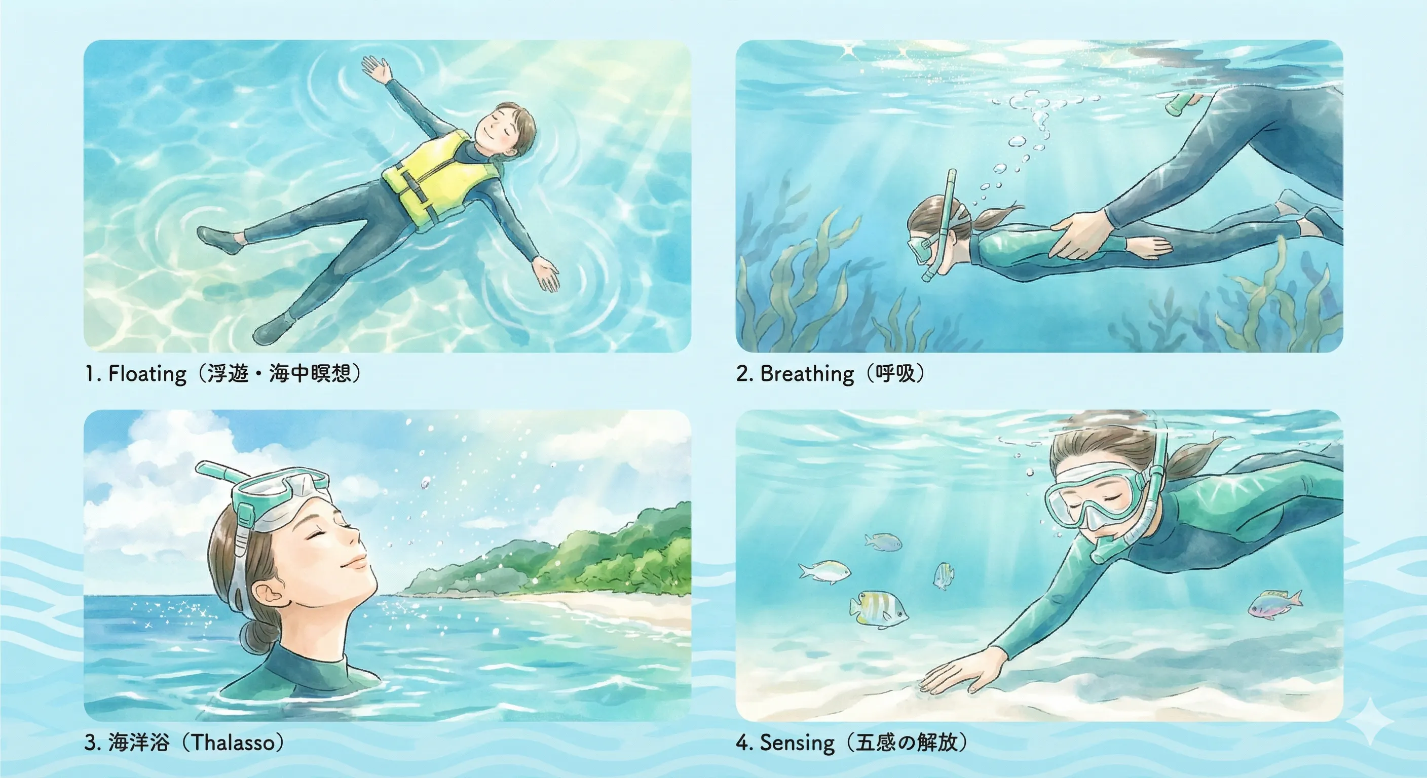 Blue Water Worldでは、このスノーケリングの特性を活かし、「癒し」や「整う感覚」にフォーカスしたプログラムを提供します。