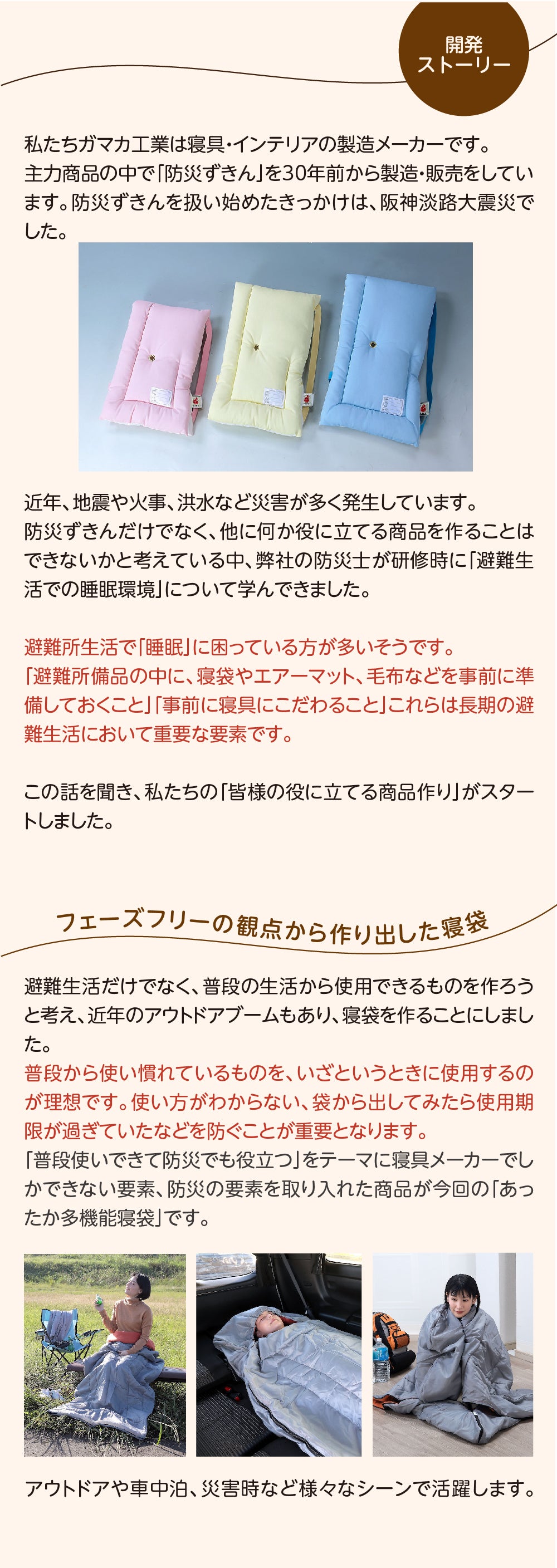 昨今のアウトドアブーム、そして突然襲ってくる自然災害など、こんなときに手元にあったら便利なアイテムが寝袋です。防災士が考えた防災要素を取り入れた寝袋にエアーマットをセットにした「寝袋+エアーマットセット」。寝袋には弊社の爆発的人気商品「岩盤浴シリーズ」で使用している中わたを使用しています。
