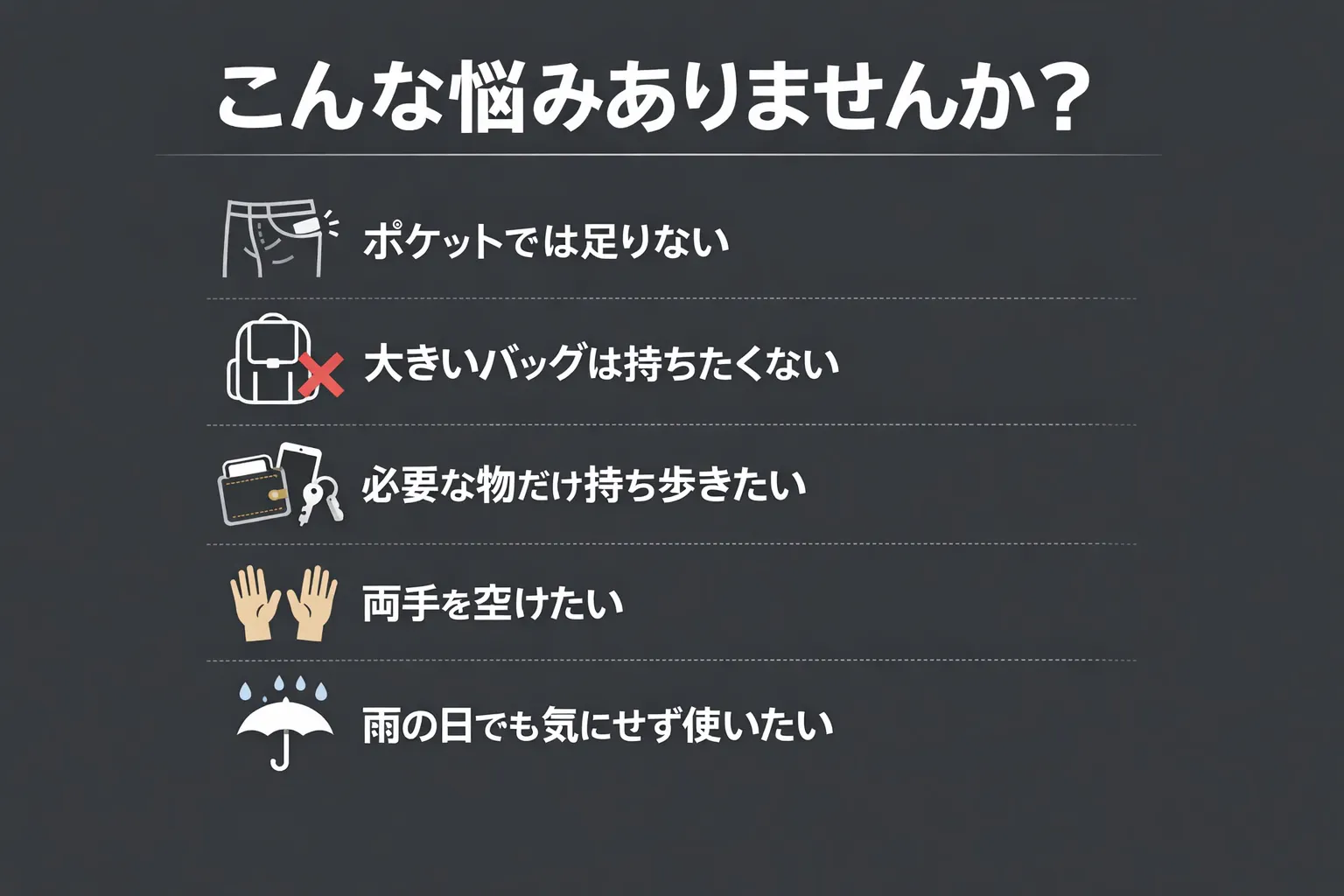 “本当に必要なものだけを、すぐ取り出せて、濡れずに持ち歩けるバッグがほしい。”