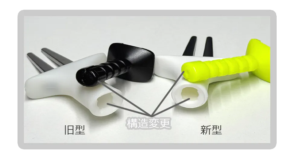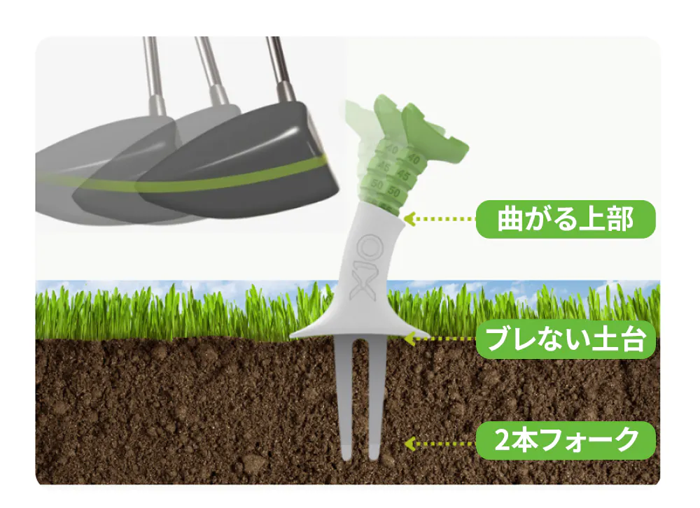 平らな2本フォークは打ち抜き方向に対して抵抗なく抜けます。左右に対してはしっかり地面にささり、前方には抵抗が無いため、ティーが飛んでいくことなく、斜めに芝面に残ります。