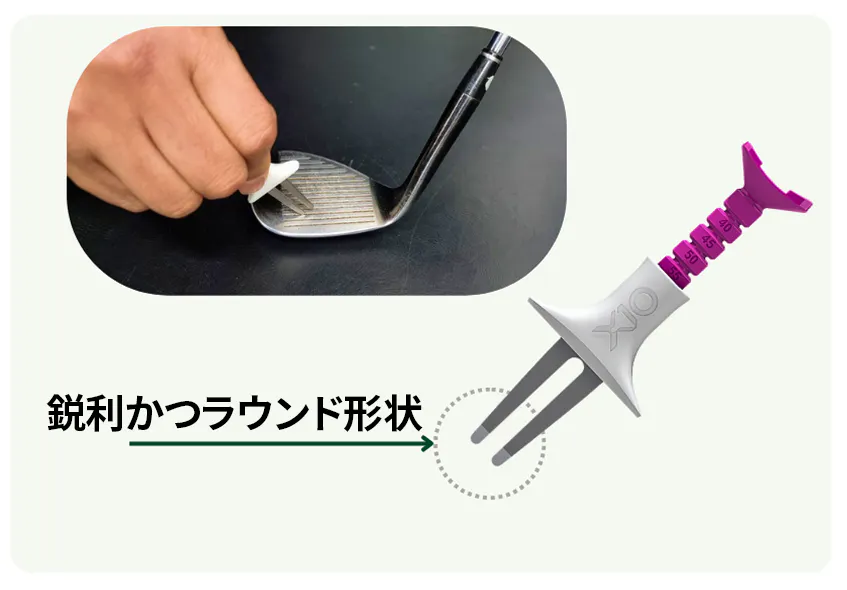 この鋭利な先端はクラブのフェイス溝に詰まった土や汚れをサッと取り除ける形状に加工されています。