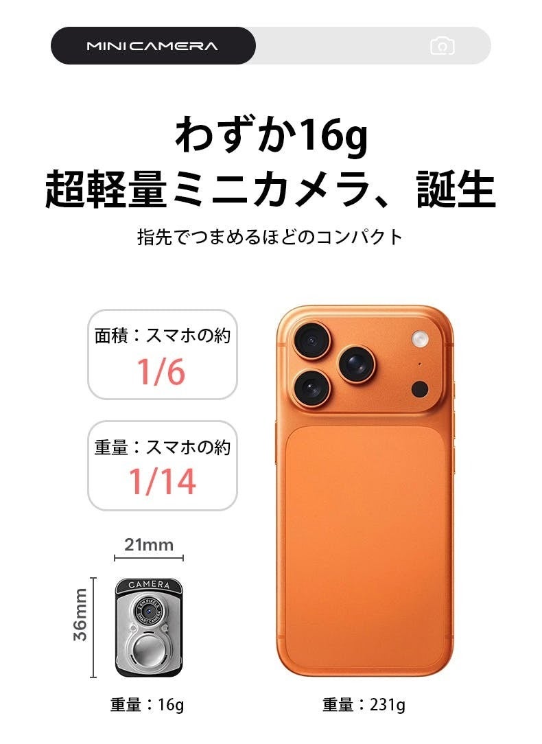 わずか16gの超軽量設計で、ポケットやバッグの隙間にもすっきり収納できるコンパクトサイズ。持ち歩きやすく、外出先でも気軽に撮影を楽しめるため、いつでもどこでも思い出を残すことができます。