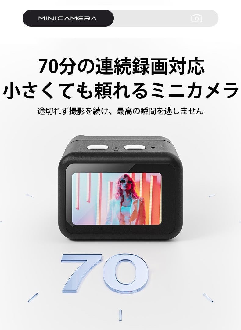 200mAhの大容量バッテリーを搭載しており、最大約70分の連続撮影が可能。充電切れを気にせず、外出先でも快適に撮影を楽しめます。