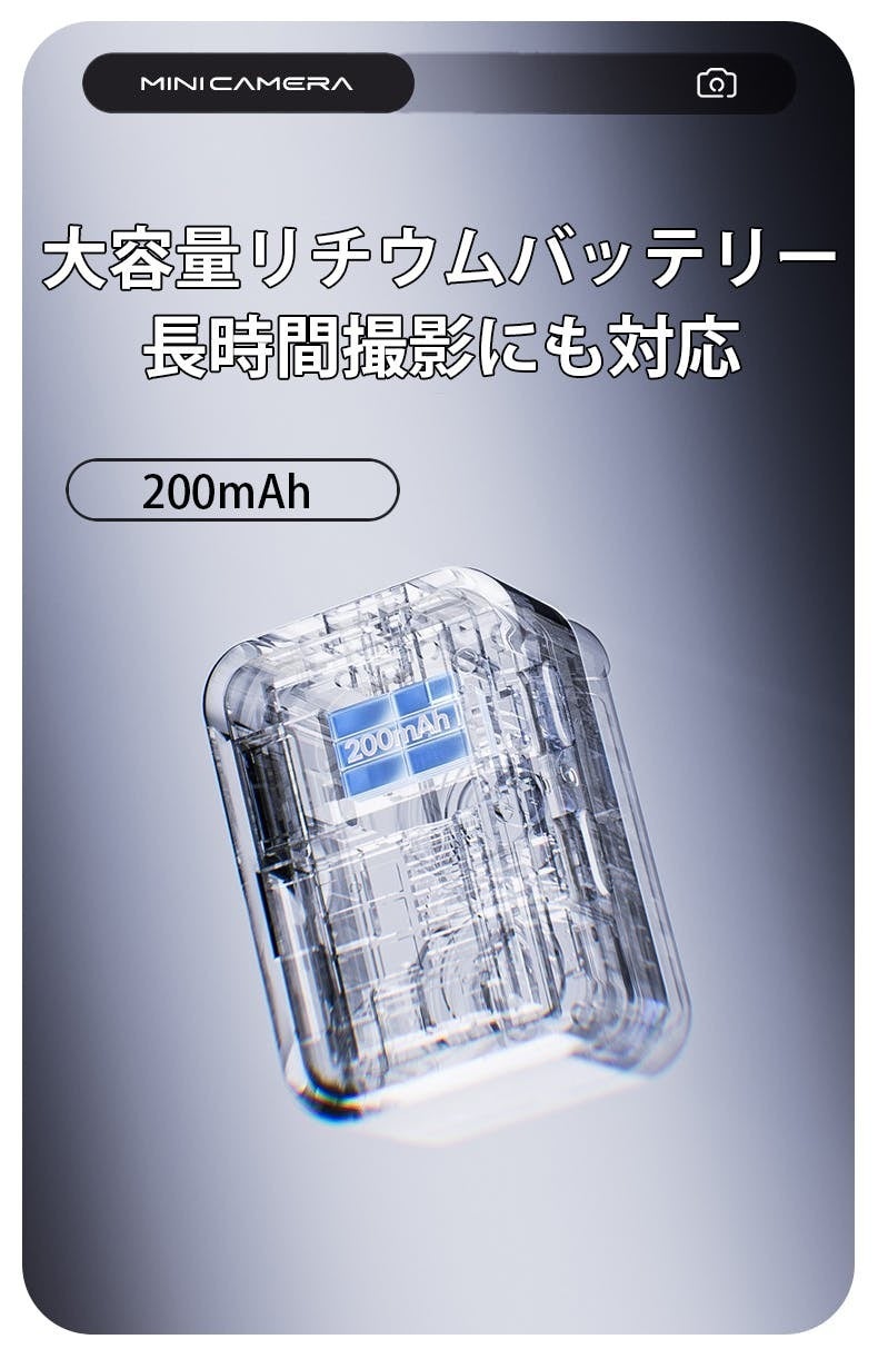 200mAhの大容量バッテリーを搭載しており、最大約70分の連続撮影が可能。充電切れを気にせず、外出先でも快適に撮影を楽しめます。