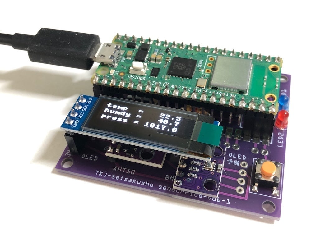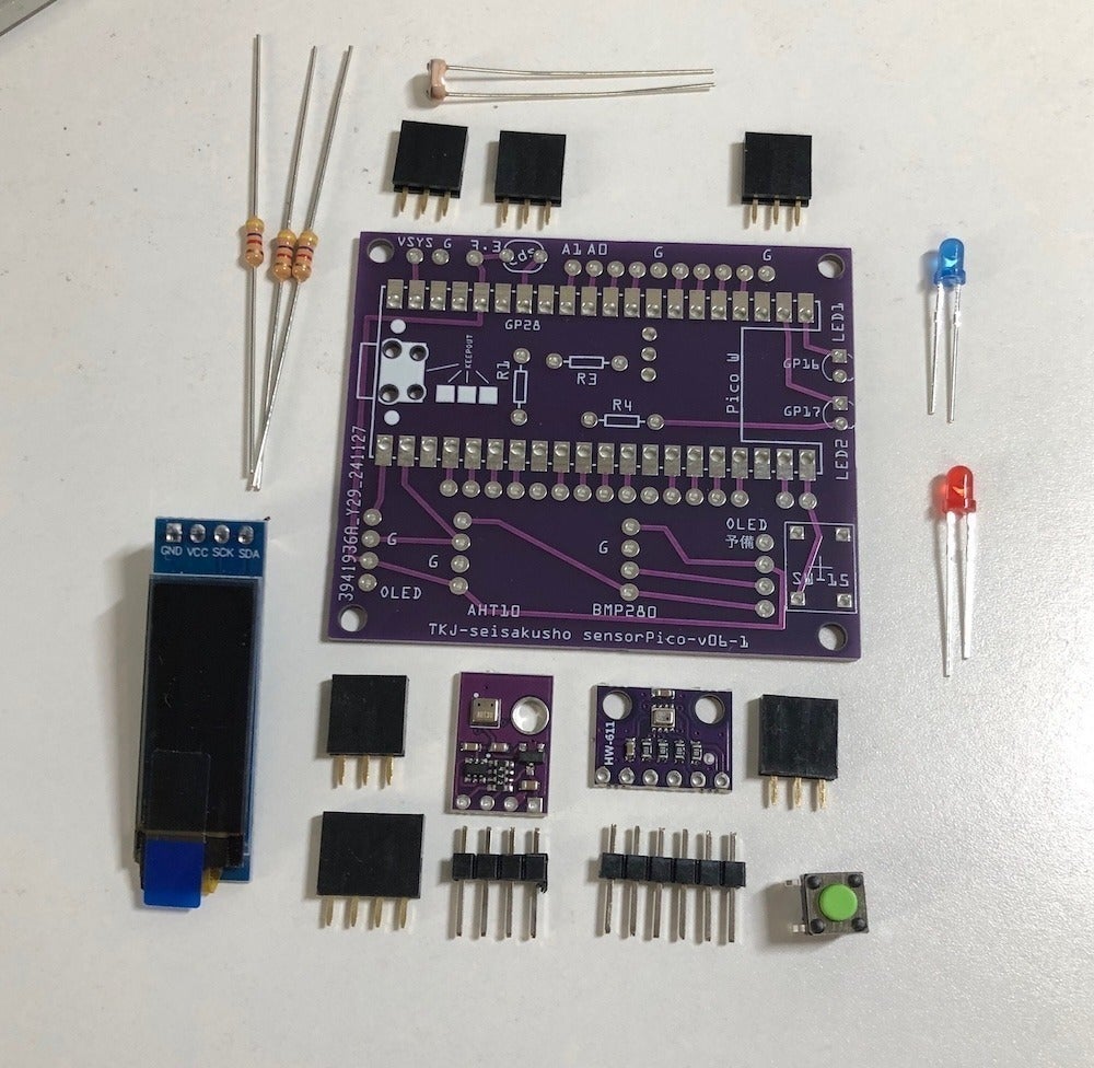 Raspberry Pi PicoWを使った環境測定基板(picoSensorV2)。 気温、湿度、気圧、明暗度を測定し、表示することが出来ます。スタンドアローンで基板上の液晶ディスプレイに表示するとともにWeb上のデータ表示サービスambientへデータを送信し、お好みのダッシュボード表示が可能です。ambientでの表示は無料アカウント内で十分な表示が可能ですが、より高度な利用を行うための有料サービスも利用可能です。また、基板上にLED2個とタクトスイッチ1個がありますので、色々なカスタマイズも可能となっています。