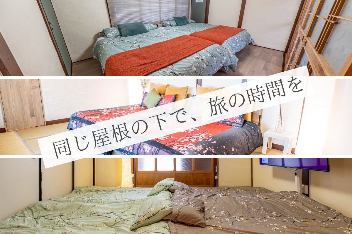 1階にはダブルベッド4台と布団セット4組、2階にはクイーンベッド2台を設置しており、ゆったりとお過ごしいただけます。