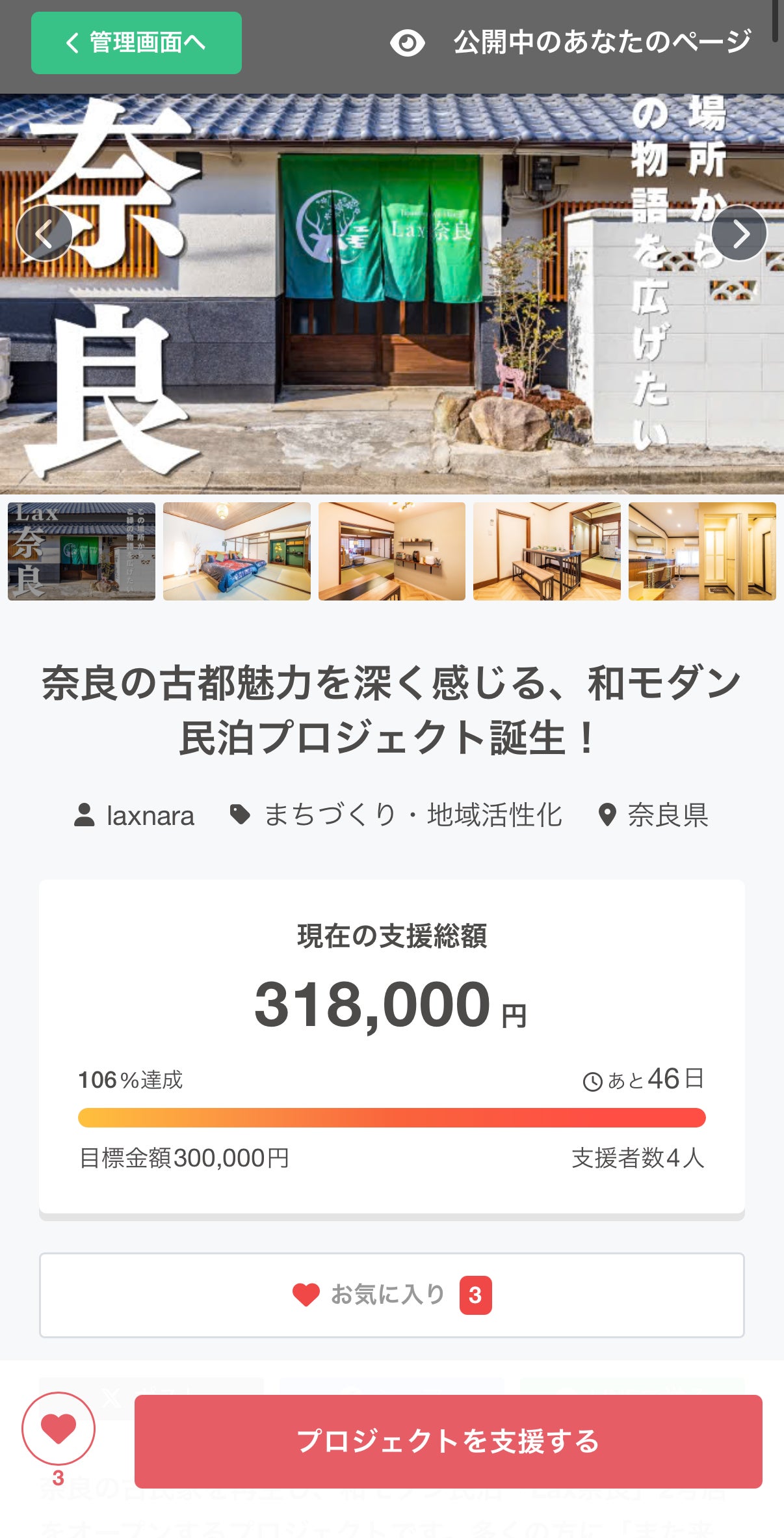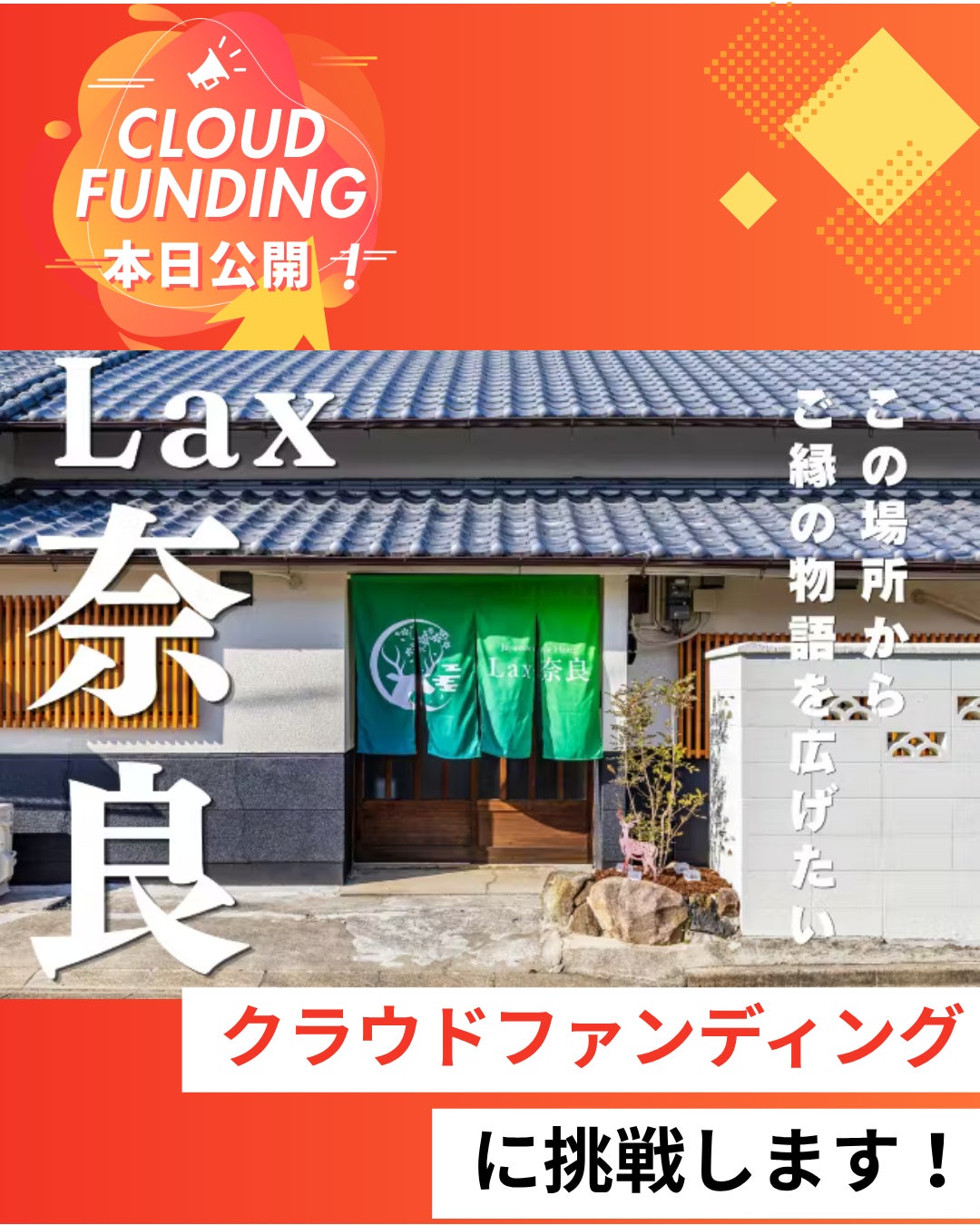 2026/04/14 19:42本日、Lax奈良2号店のクラウドファンディングを公開しました。このページを見つけてくださった皆さま、本当にありがとうございます。私たちは奈良で、ただ泊まるだけではなく、心がほどける時間を過ごしていただける宿を目指してきました。今回のプロジェクトでは、その想いをもう一歩広げて、Lax奈良2号店づくりに挑戦しています。2号店ができると、Lax奈良と合わせて最大24名までご宿泊いただける形になります。家族旅行やグループ旅行でも、もっとゆっくり奈良を楽しんでいただける場所をつくっていきたいと思っています。ご支援はもちろん、ページをご覧いただいたり、周りの方にシェアしていただけるだけでも大きな力になります。これから活動報告でも、リターンのことや宿づくりのことを少しずつお伝えしていきます。どうぞよろしくお願いいたします。 もっと見る