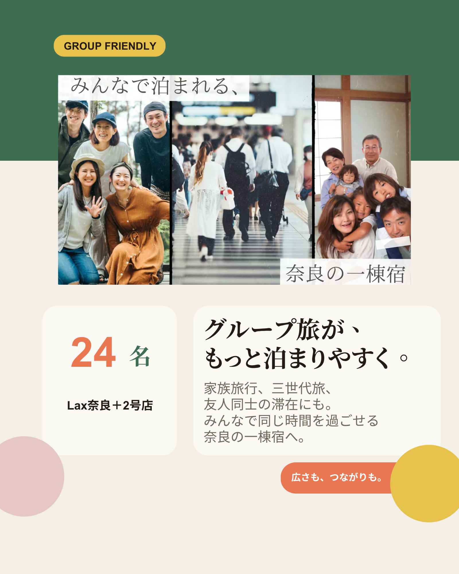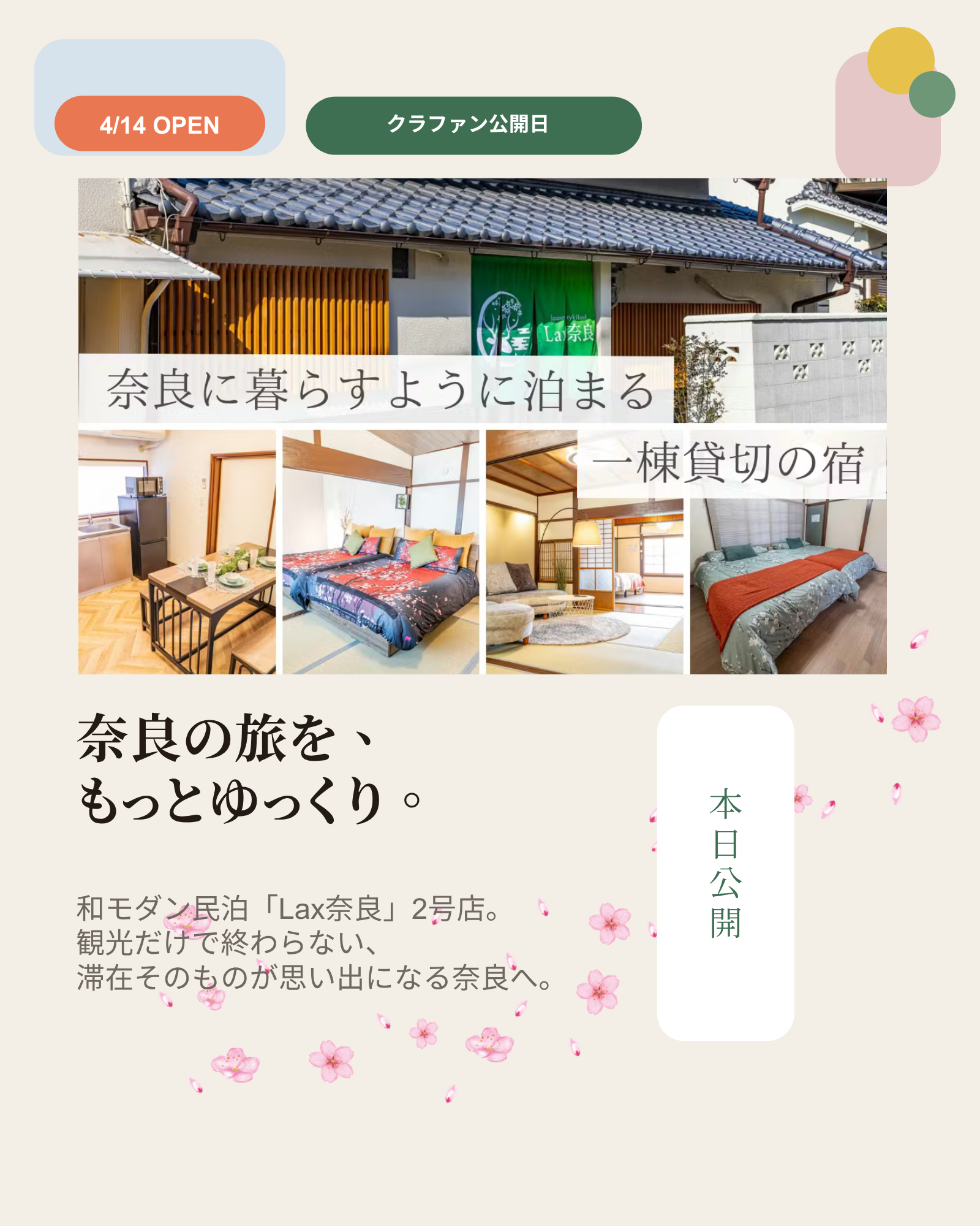 私たちは奈良で、ただ泊まるだけではなく、心がほどける時間を過ごしていただける宿を目指してきました。今回のプロジェクトでは、その想いをもう一歩広げて、Lax奈良2号店づくりに挑戦しています。