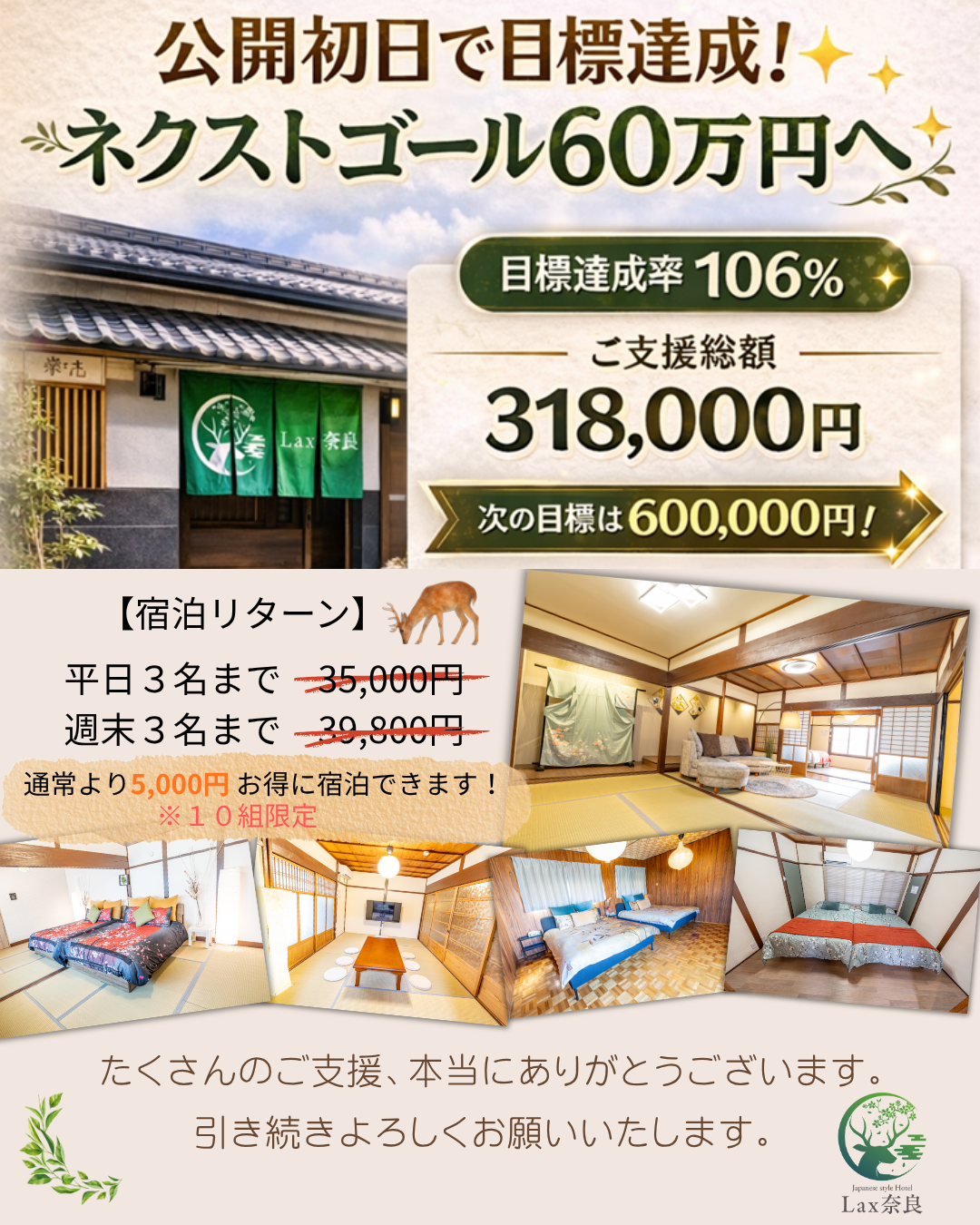 昨日公開した、Lax奈良2号店のクラウドファンディング。おかげさまで、公開初日で目標を達成することができました。
