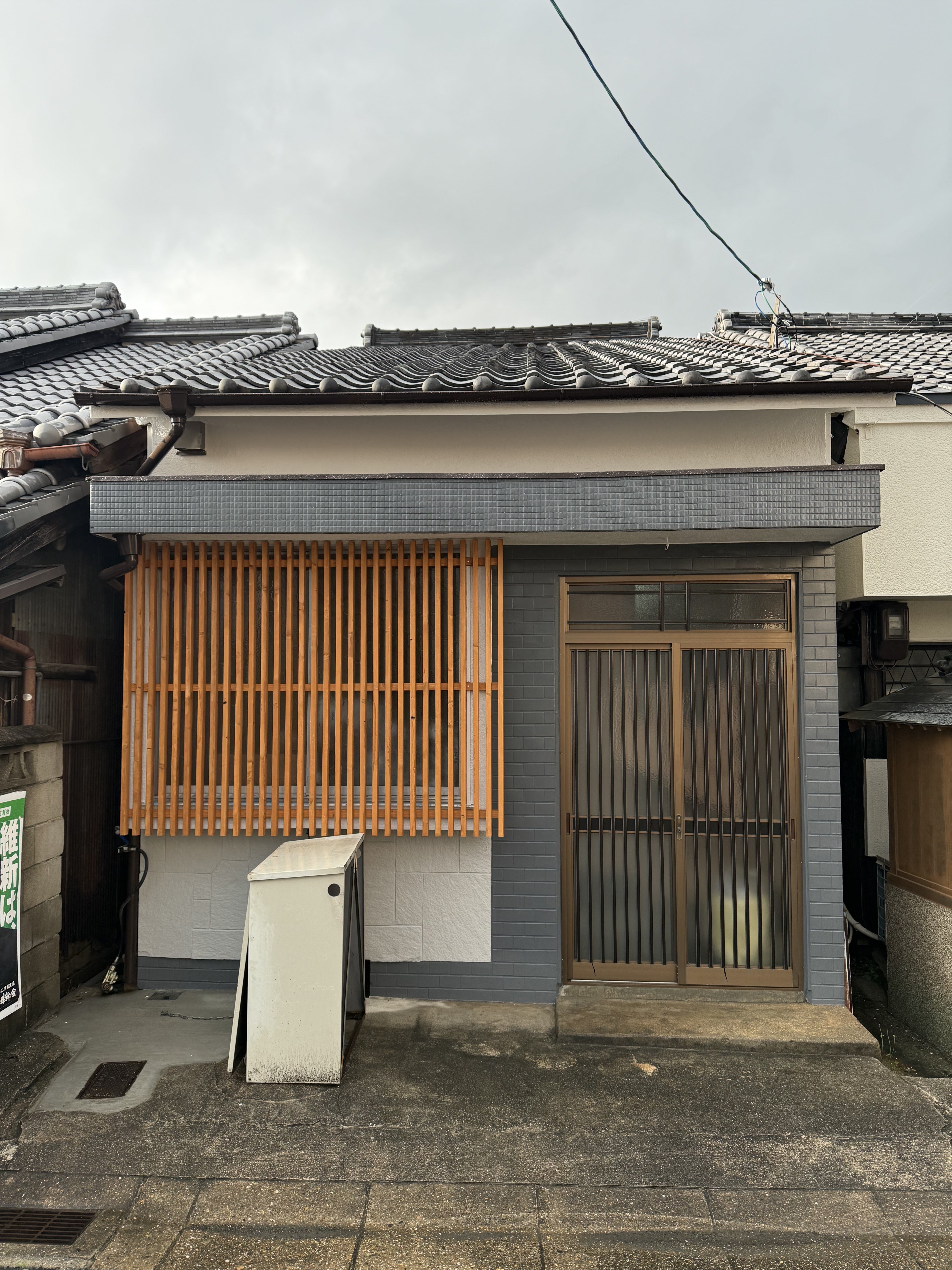 この面格子は、一本一本手作りで仕上げてもらったもので、色もスタッフと一緒に塗りました。Lax奈良1号店のときと同じ色、同じデザインでそろえていて、並んだときに統一感が出るようにしています。この木のあたたかさが入るだけで、外観がぐっとやわらかく、Lax奈良らしい雰囲気になった気がしています。