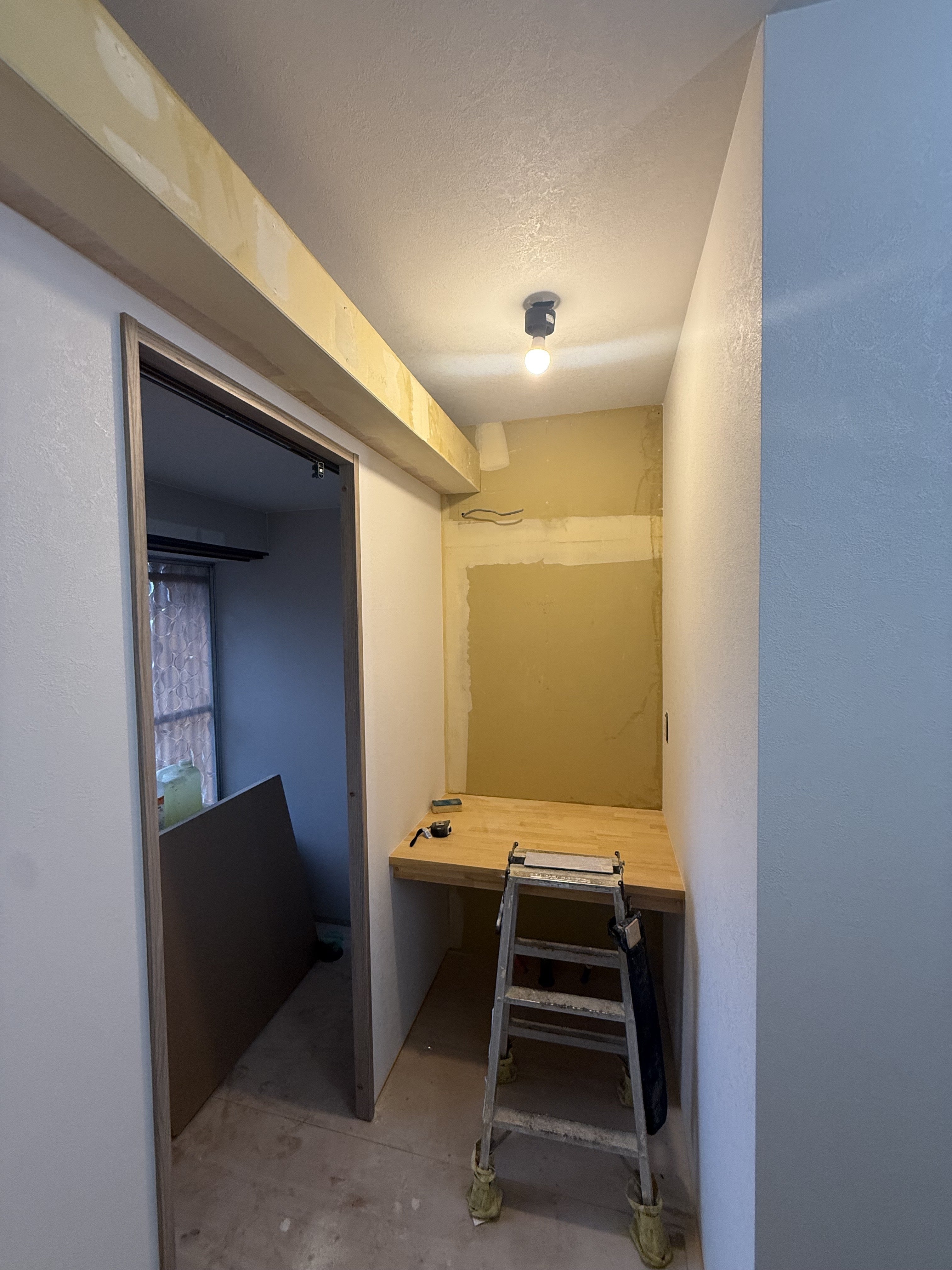 ここには可愛いミラーも置く予定で、見た目だけでなく、使いやすさもしっかり考えながら整えていきたいと思っています。朝の支度や、みんなで泊まったときにも気持ちよく使っていただけるように、工夫していく予定です。