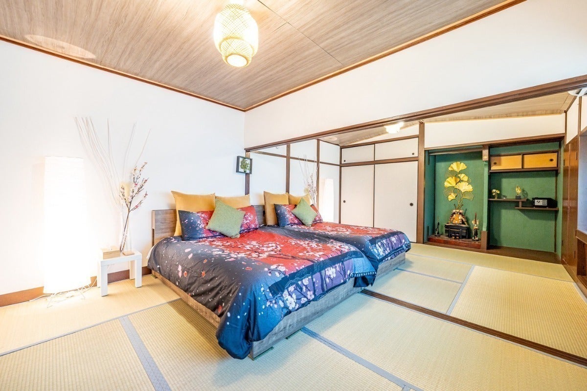 1階にはダブルベッド4台と布団セット4組、2階にはクイーンベッド2台を設置しており、ゆったりとお過ごしいただけます。