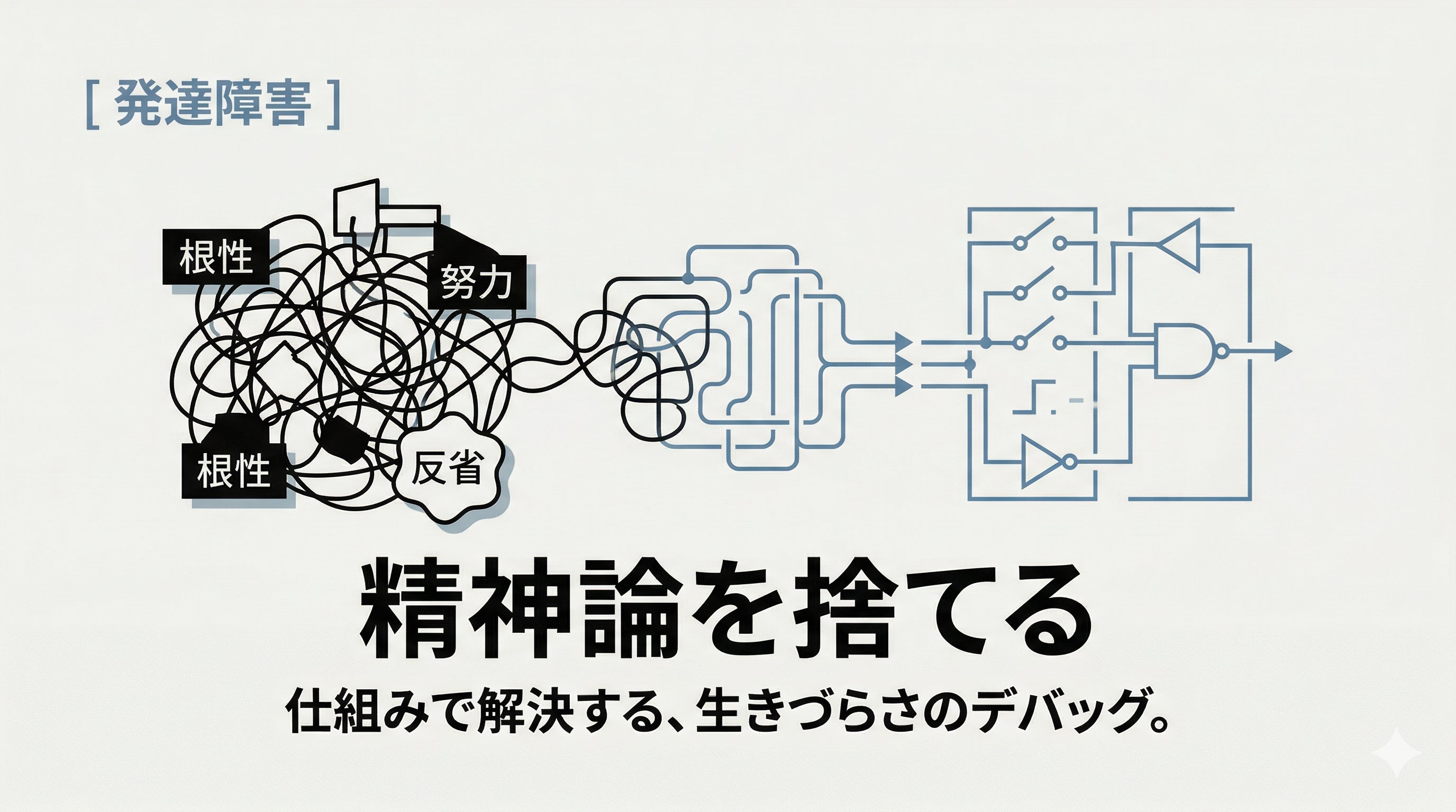 発達障害の当事者が日常で直面する「100のバグ(つまずき)」に対し、精神論を一切排除し、「物理・デジタル・環境」の3つのアプローチで強制的に解決する『生活の設計図』です。