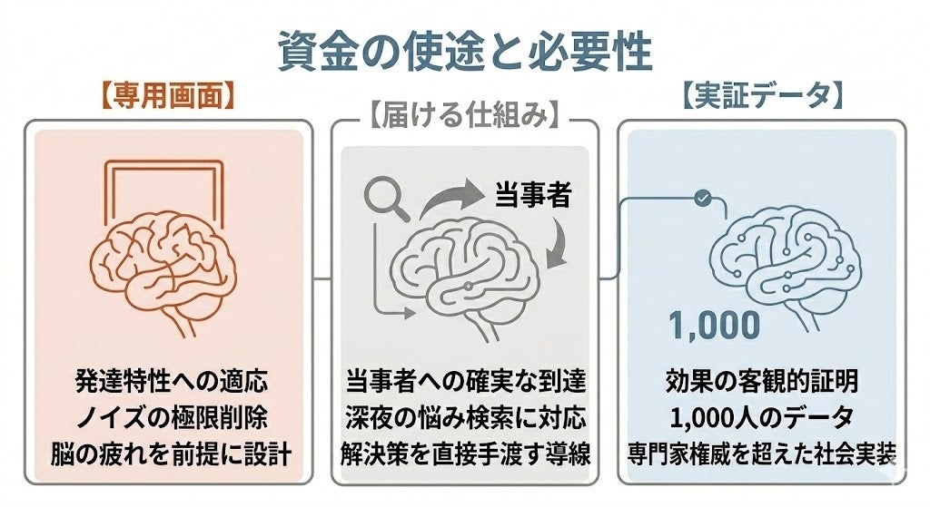目標金額の30万円は、1,000人の当事者に「ノイズのない解決」を届けるための開発・運用費として、以下の通り大切に使用させていただきます。