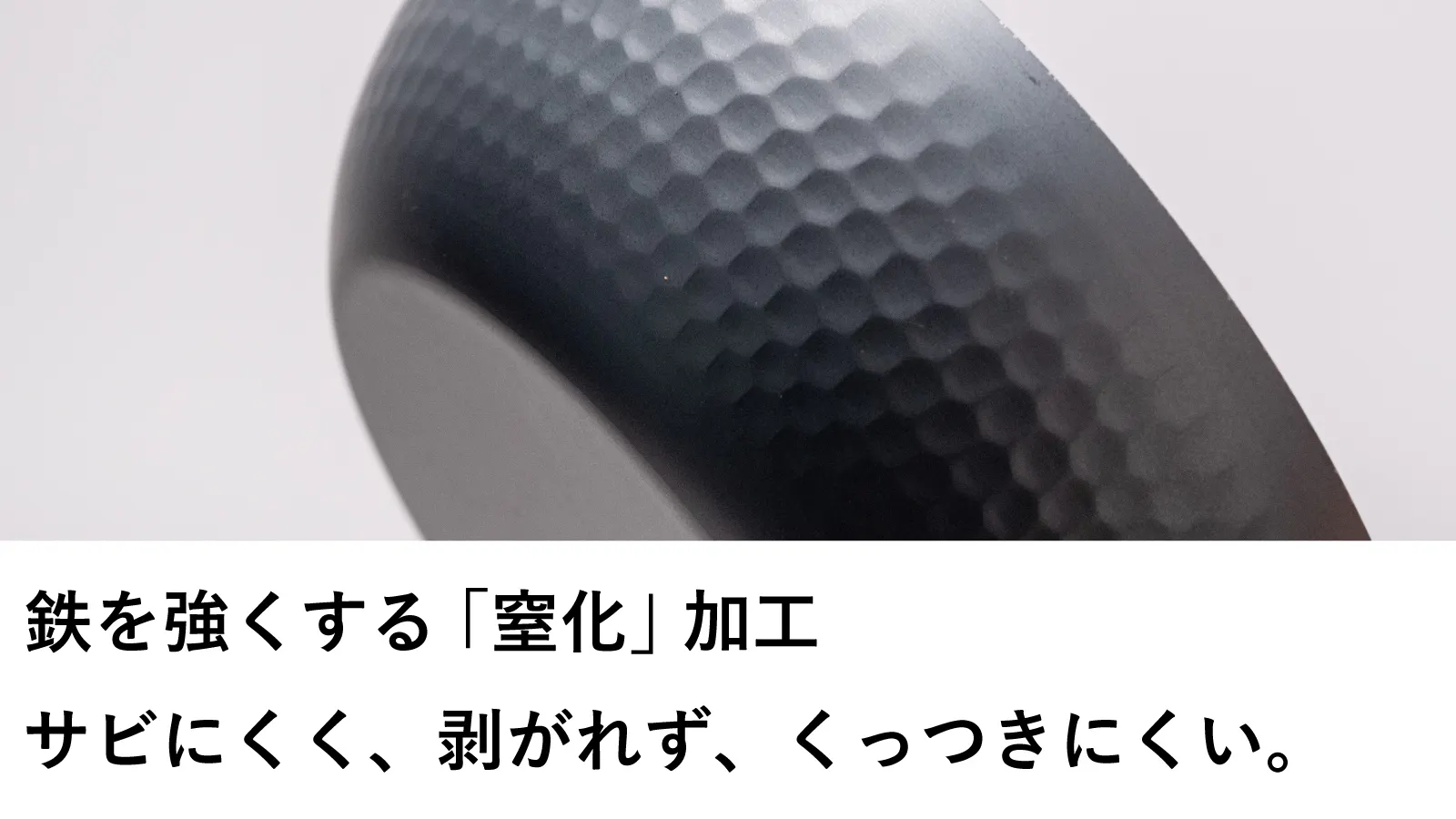 一般的な「フッ素樹脂加工」は表面に膜を“塗っている”だけなので、使ううちに剥がれてしまいます。 一方、窒化処理は鉄の組織と一体化しているため、ヘラでガシガシ使っても全く問題なし。非常に剥がれにくいと言われています。